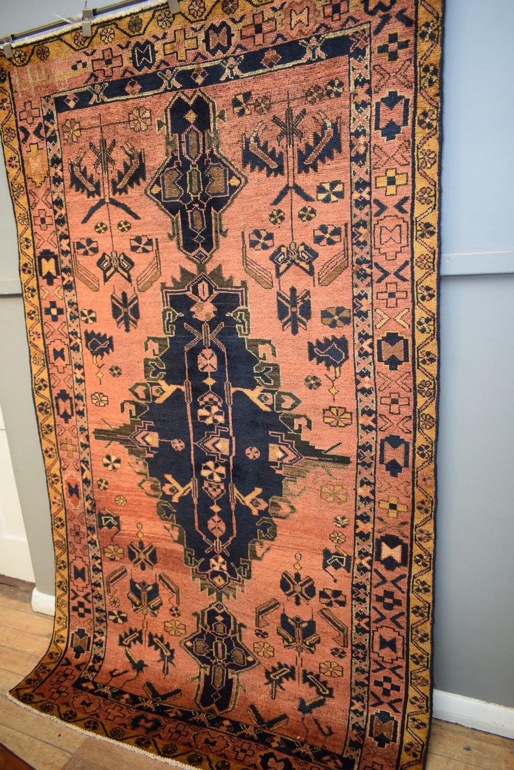 A TRIBAL PERSIAN KOHI RUG, 100% WOOL. A ROOM-SIZED HAND-KNOTTED TRIBAL WEAVE WITH DESIGN OF ELONGATED & ANCHORED MEDALLION IN A SALMON-TONED FIELD OF TRIBAL PATTERNS AND FLORAL MOTIFS. EX-GALLERY INVENTORY. IN GOOD CONDITION. CERTIFICATE OF AUTHENTICITY INCLUDED. SIZE: 265X158CM, ORIGIN: PERSIA – RRP: $3,900