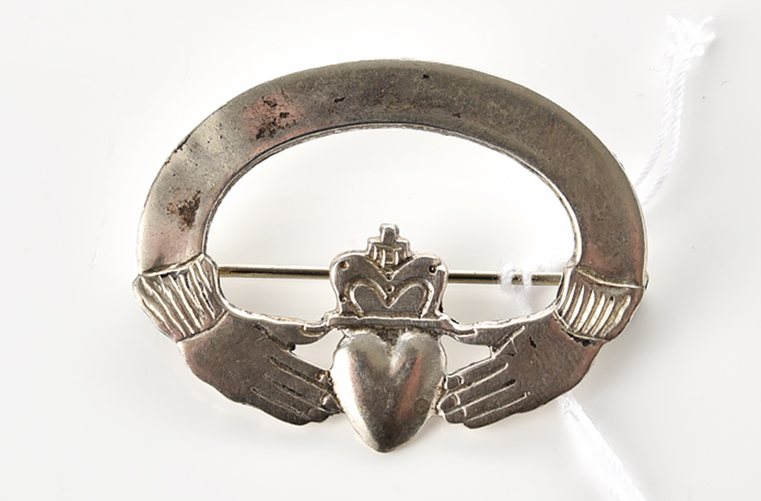 AN ANTIQUE CLADDAGH BROOCH IN STERLING SILVER, LENGTH 36MM