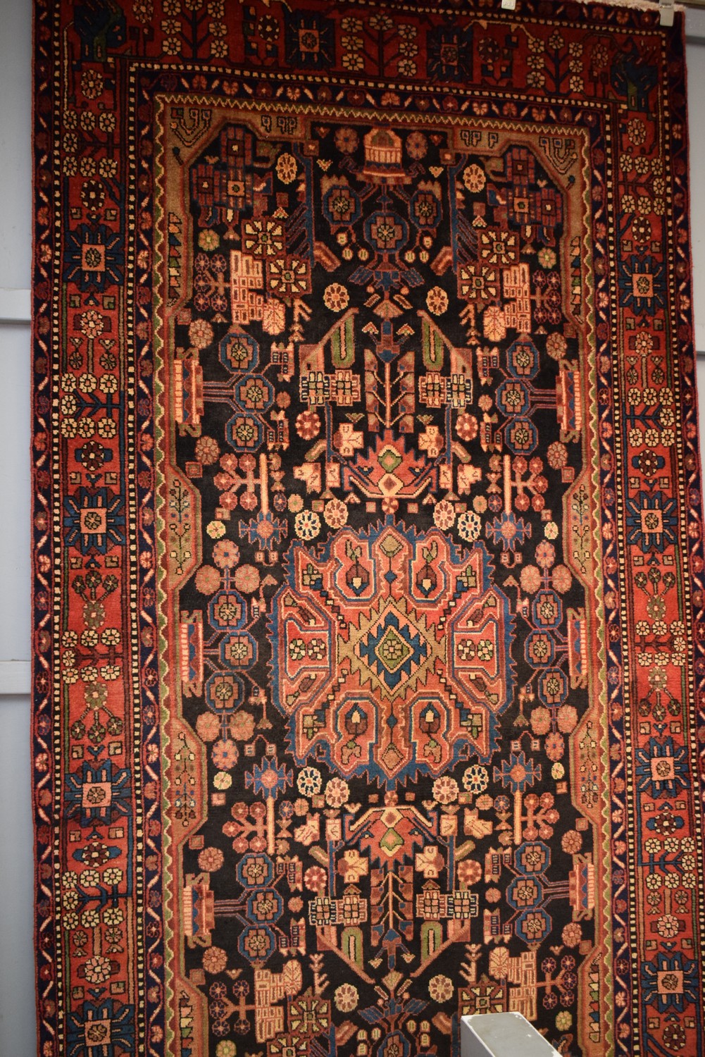 A COLLECTABLE CIRCA 1960s PERSIAN NAHAVAND RUG. 100% WOOL. NATURAL DYES. VINTAGE PILE. FULLY RESTORED AND IN BEAUTIFUL CONDITION. VILLAGE WEAVE WITH TRADITIONAL DESIGN OF STYLIZED MEDALLION SET WITHIN A FIELD OF VARYING FLORAL PATTERNS. BORDER OF FLORAL PATTERNS. GALLERY INVENTORY. CERTIFICATE OF AUTHENTICITY INCLUDED. SIZE: 303X160CM, ORIGIN: PERSIA – RRP: $3,300