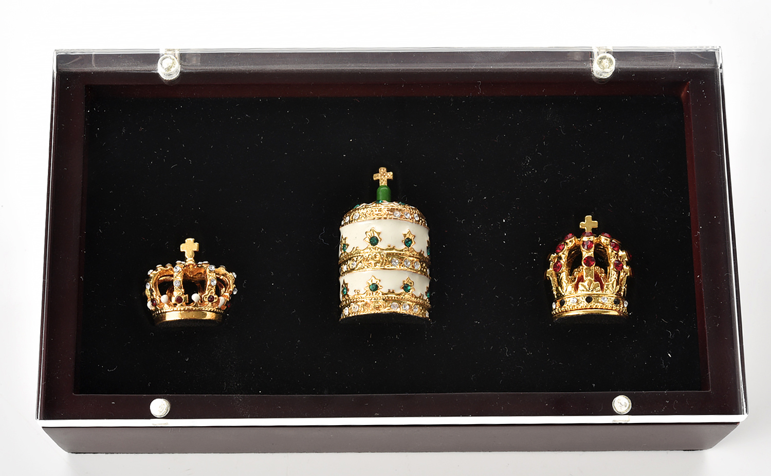 THREE MINIATURE REPLICAS OF BEJEWELED HISTORICAL CROWNS SET WITH PASTE IN GILT BRASS AND ENAMEL COMPRISING: THE CORONATION CROWN OF NAPOLEON, THE CORONATION OF THE EMPRESS JOSEPHINE AND THE 1804 POPE PIUS VII TIARA, PRESENTED IN A WELL MADE DISPLAY BOX WITH INFORMATION CARDS
