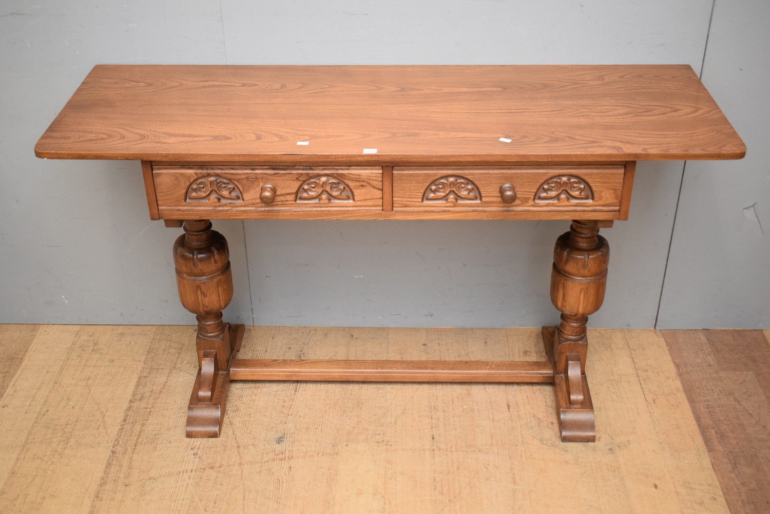 AN OAK CARVED TWO DRAWER CONSOLE WITH STRETCHER BASE (77H X 138W X 46D CM)