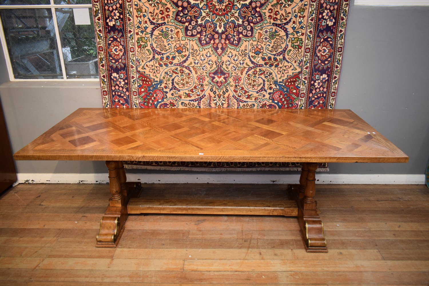 A SUBSTANTIAL FRENCH STYLE STRETCHER BASE DINING TABLE WITH PARQUETRY INLAID TOP (A/F) (PLEASE NOTE THIS HEAVY ITEM MUST BE REMOVED BY CLIENTS OR CARRIERS AT THE CUSTOMERS EXPENSE. LEONARD JOEL STAFF CANNOT ASSIST CARRYING THIS ITEM) (78H X 240W X 100D CM)
