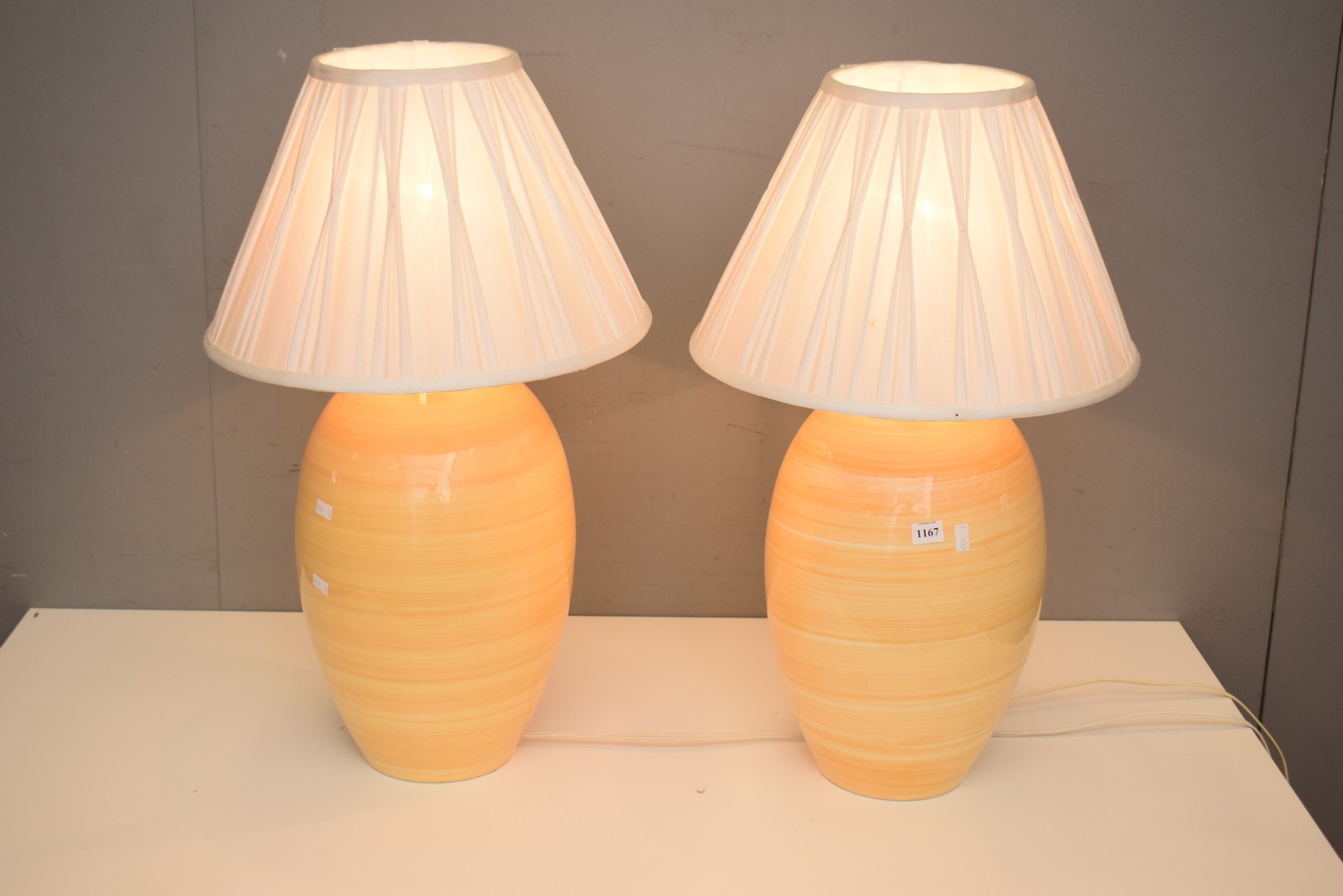 A PAIR OF YELLOW CERAMIC TABLE LAMPS (62 CM H)