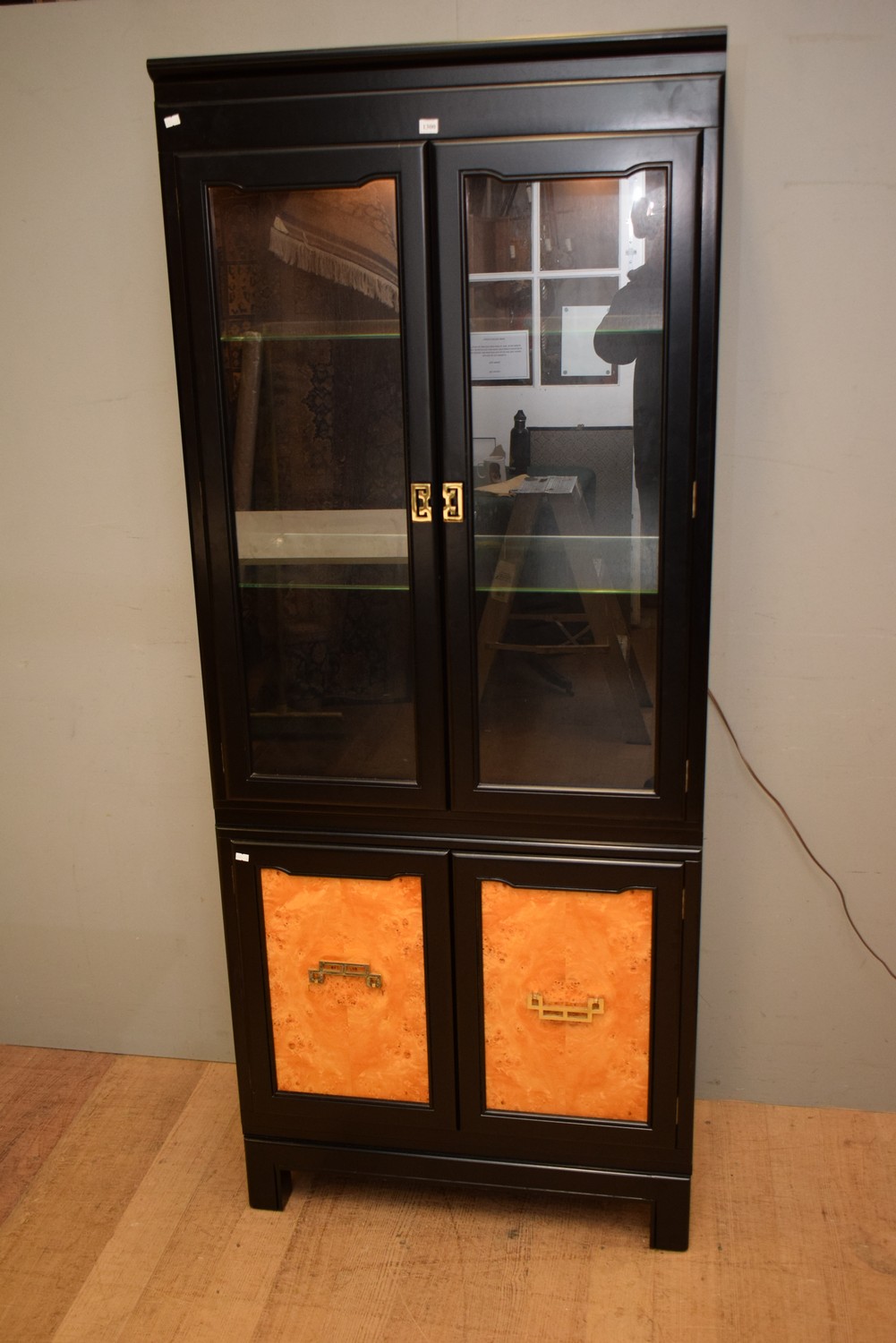 AN EBONISED DOUBLE BODIED CHINESE STYLE CABINET WITH BURR WALNUT DETAILING BY VAN TREIGHT (195H X 80W X 45D CM)