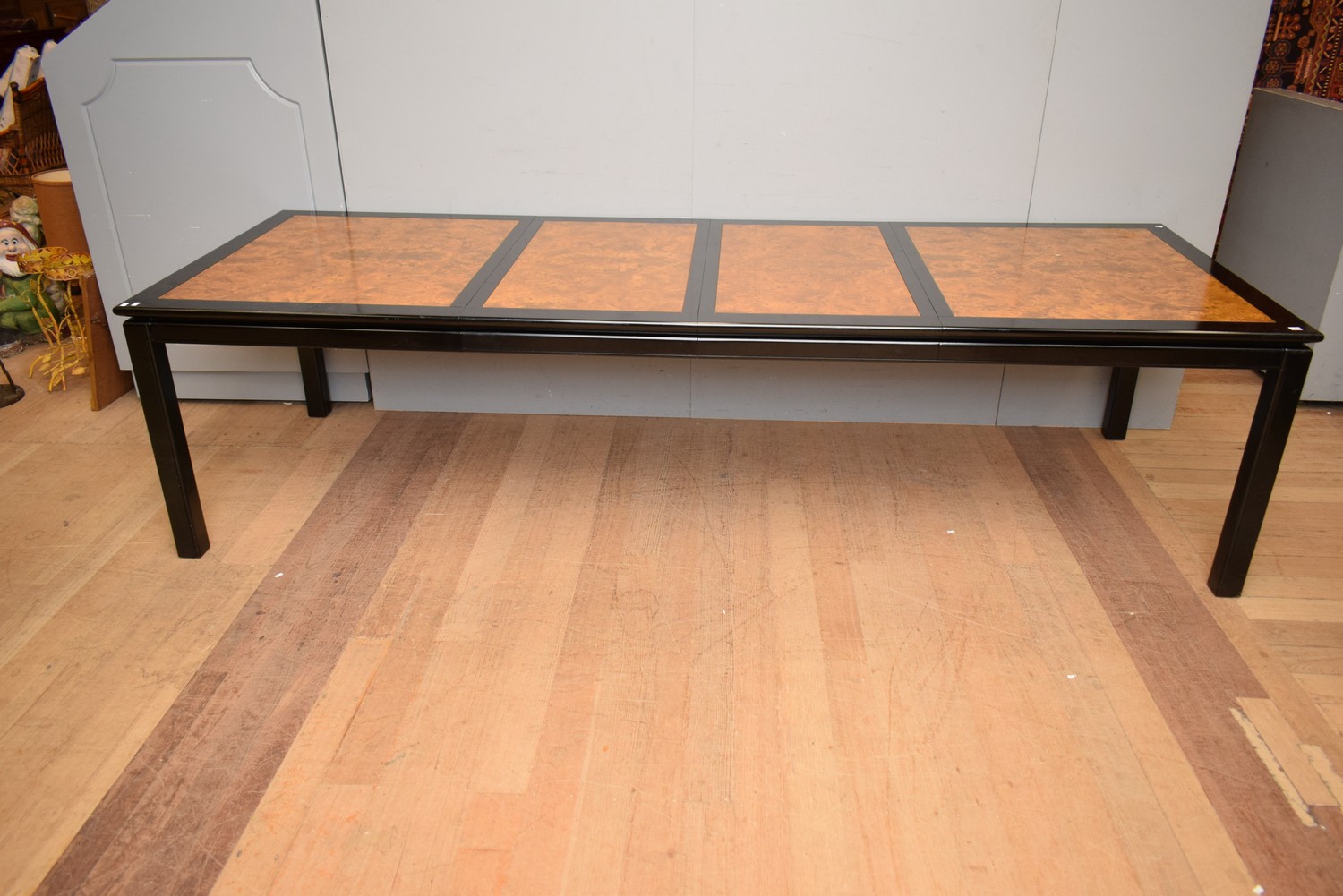 AN EBONISED CHINESE STYLE TWO LEAF EXTENSION DINING TABLE INSET WITH BURR WALNUT BY VAN TREIGHT (75H X 294W X 105D CM)