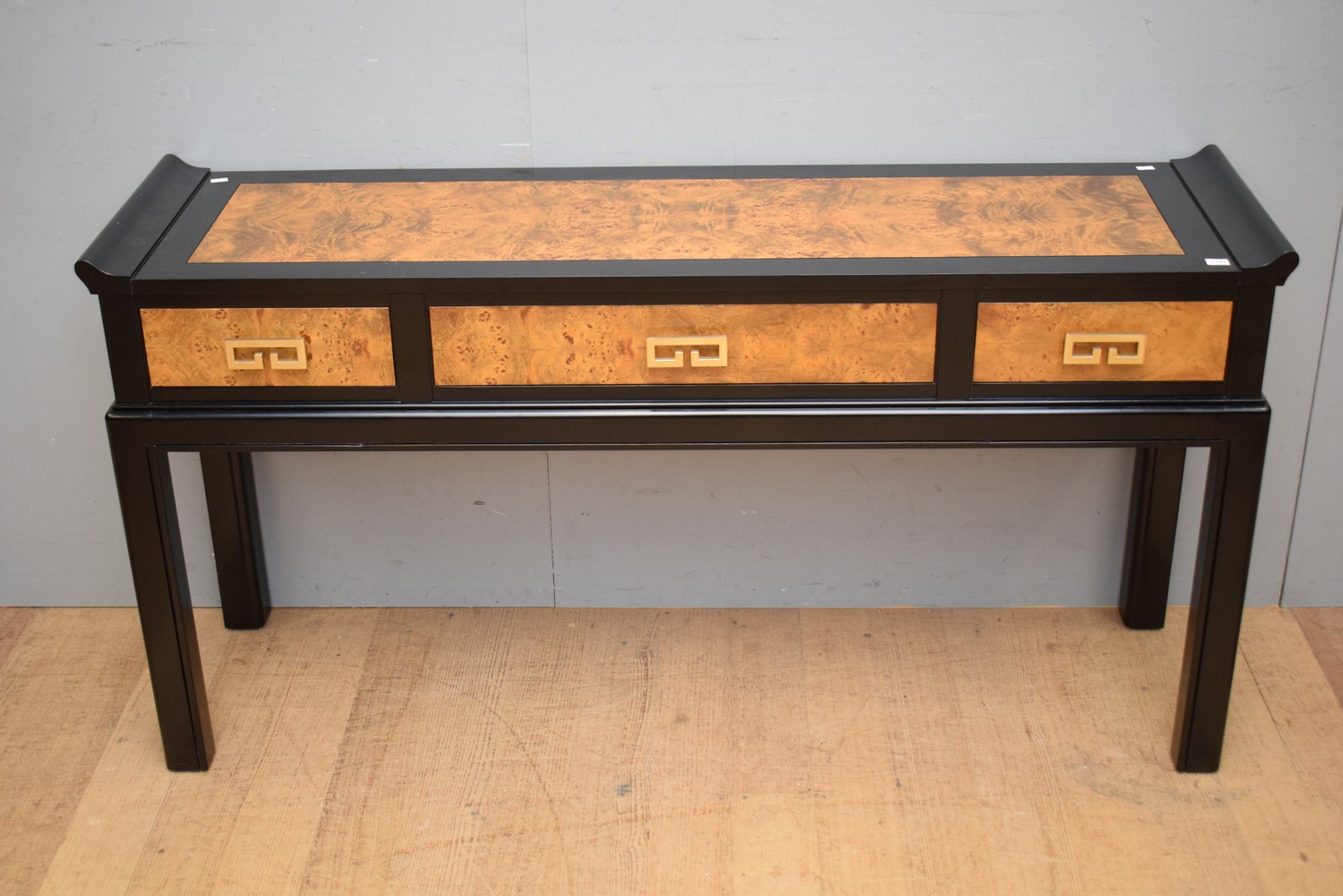 AN EBONISED CHINESE STYLE ALTAR TABLE WITH BURR WALNUT INSET BY VAN TREIGHT (75H X 143W X 40D CM)