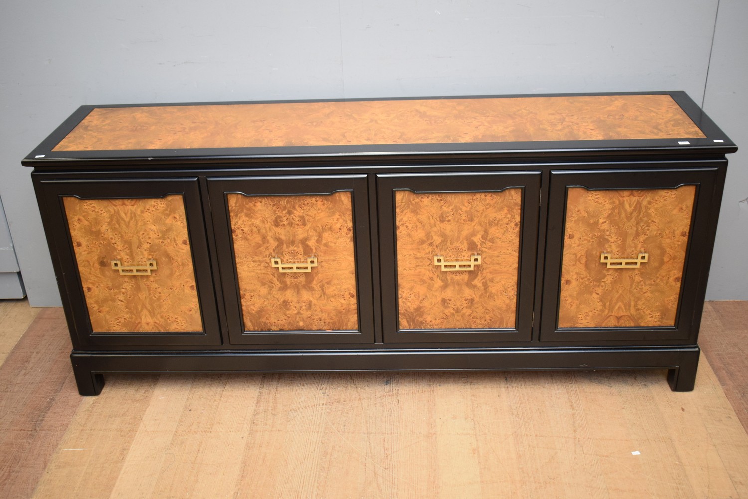 AN EBONISED CHINESE STYLE FOUR DOOR SIDEBOARD WITH BURR WALNUT PANELS BY VAN TREIGHT (76H X 185W X 45D CM) (A/F)