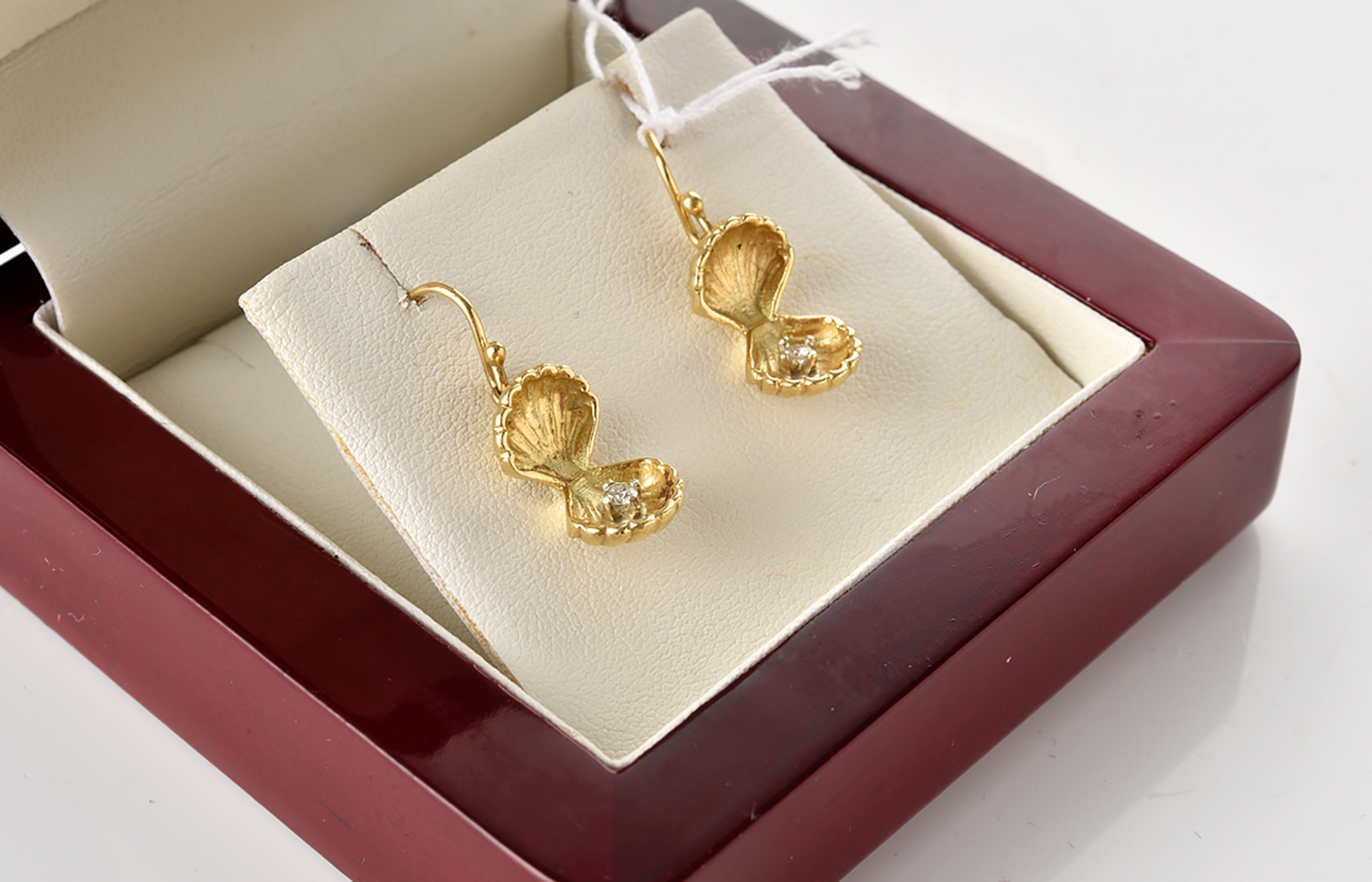 A PAIR OF HANDCRAFTED DIAMOND SET CLAM SHELL EARRINGS IN 18CT GOLD, TO SHEPHERD HOOK FITTINGS, BOXED, 4.2GMS
