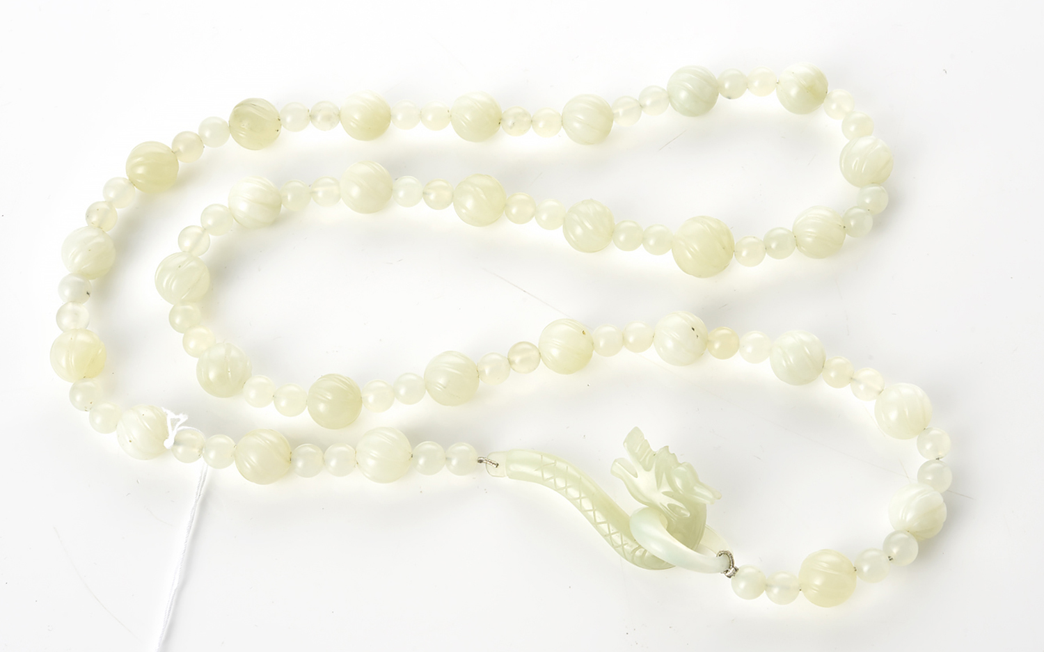 A JADE AND GLASS BEAD NECKLACE WITH CARVED DRAGON CLASP, TOTAL LENGTH 94CM