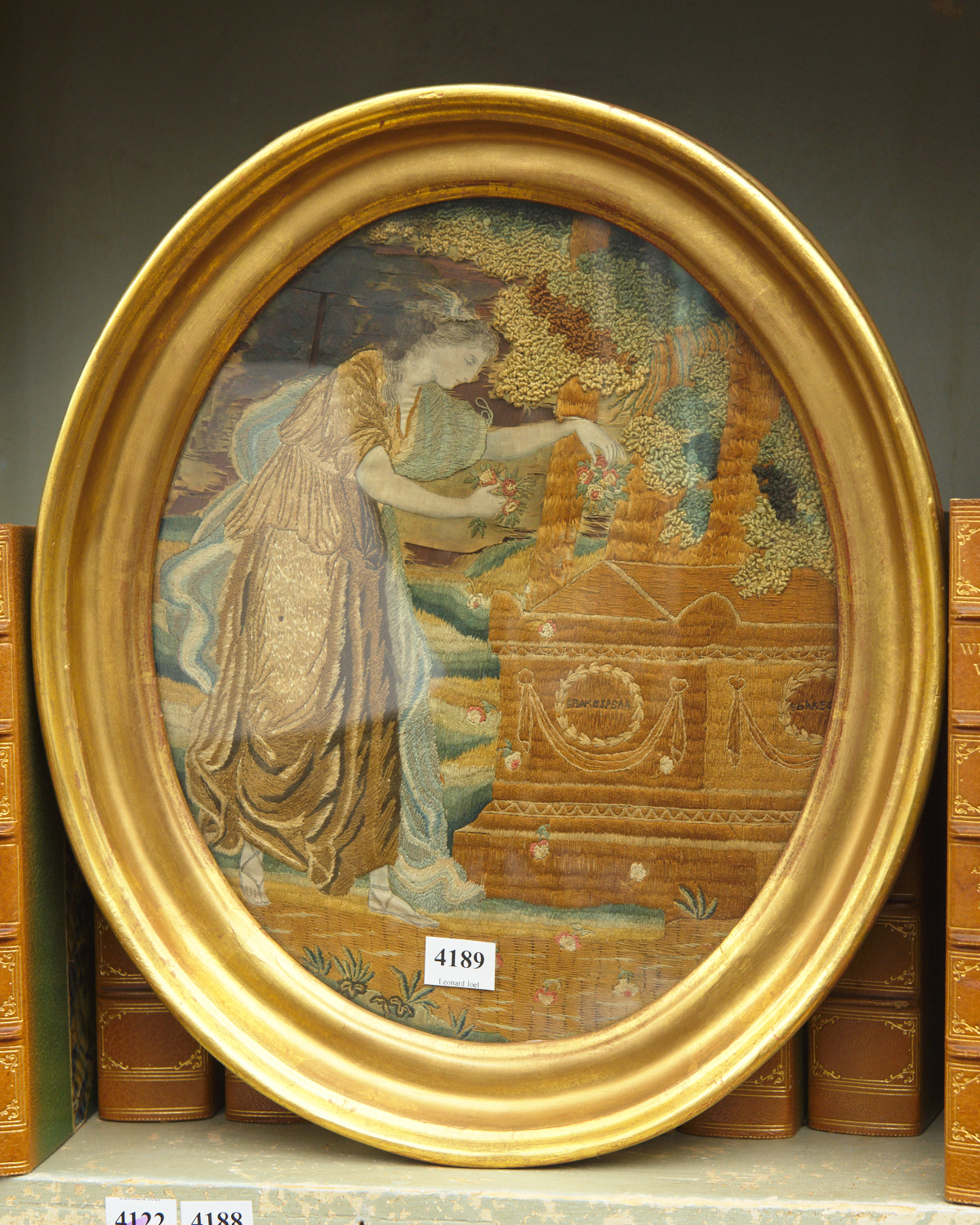 AN ANTIQUE NEEDLEWORK 'TOMB OF SHAKESPEARE', IN AN OVAL GILTWOOD FRAME