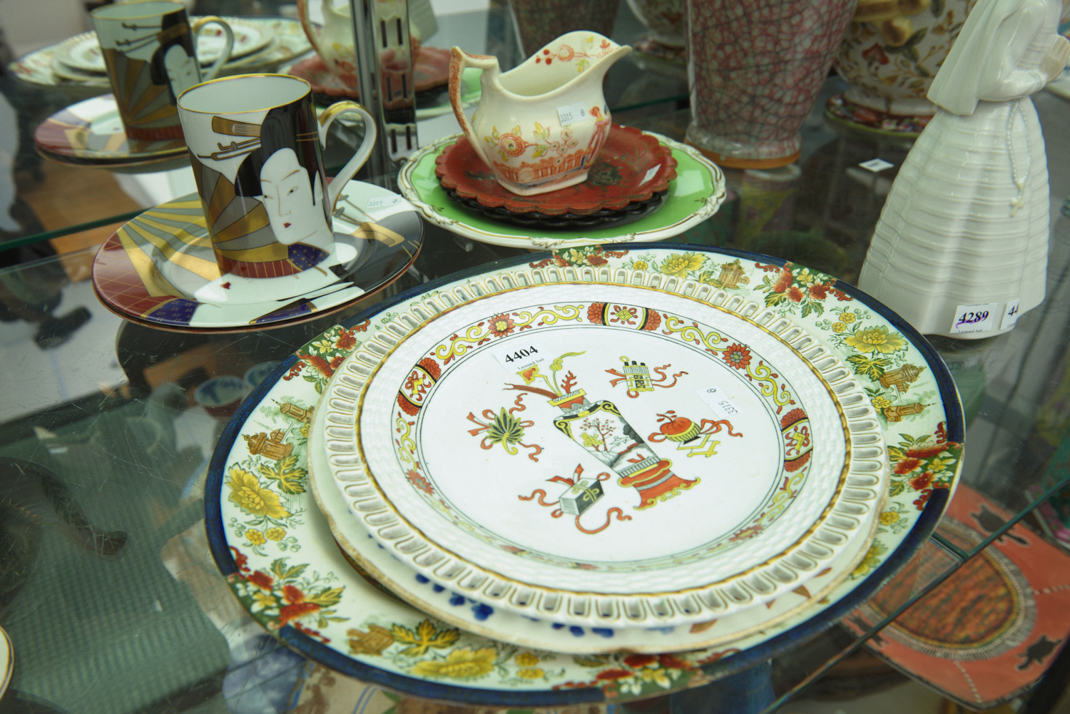 PORCELAIN INCLUDING PLATES, FITZ & FLOYD 'GEISHA' TEACUP AND SAUCER, AN EARLY STAFFORDSHIRE CREAMER, ETC