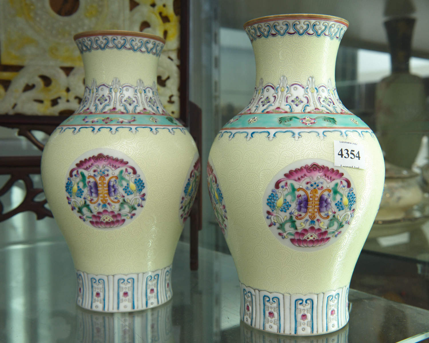 A PAIR OF FAMILLE ROSE VASES, 22 CM HIGH