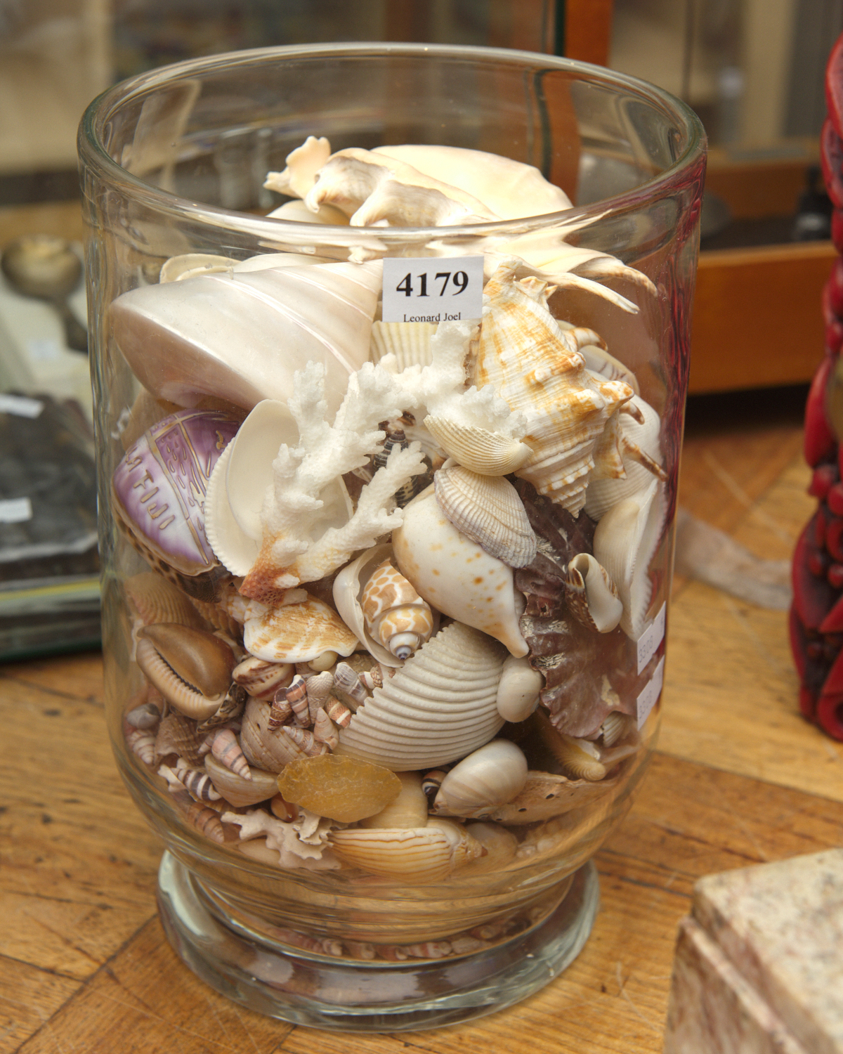 A COLLECTION OF SHELLS IN A CLEAR GLASS CONTAINER