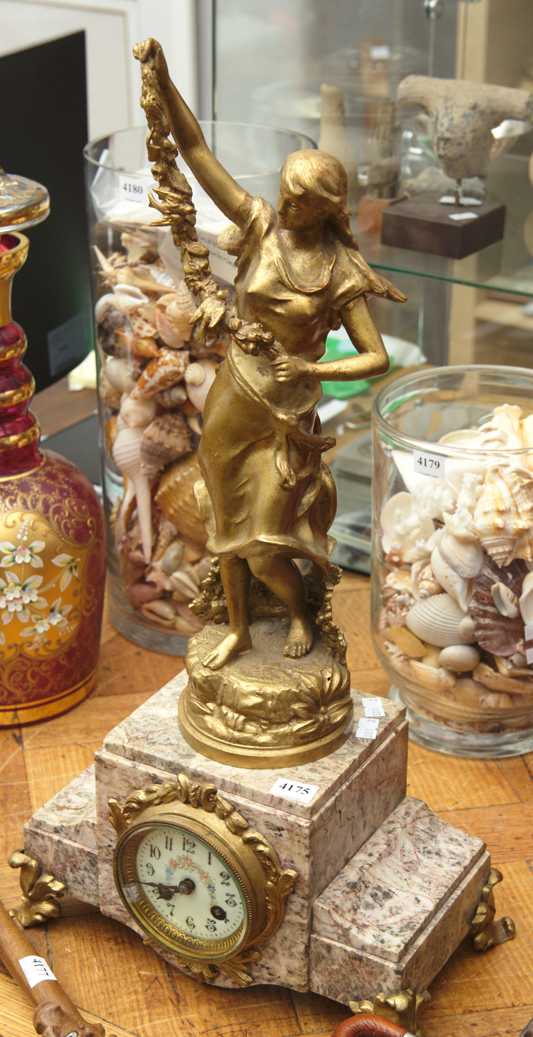 A SPELTER FIGURAL MANTLE CLOCK ON MARBLE BASE, 56 CM HIGH