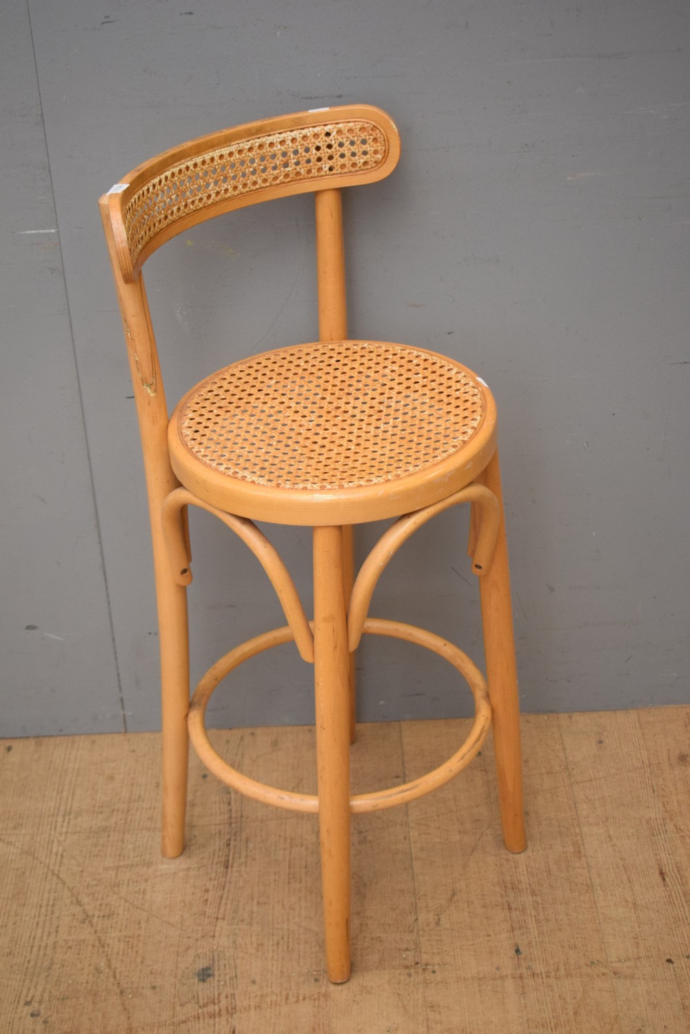 A BENTWOOD AND RATTAN BAR STOOL (89H X 35D CM)