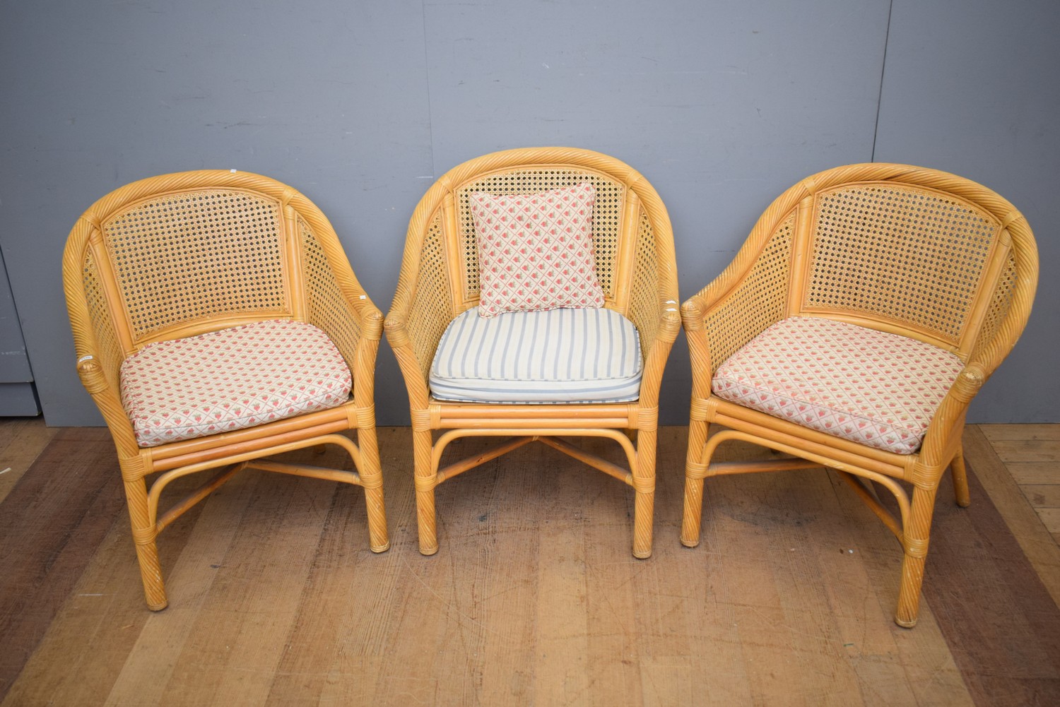 THREE CANE AND RATTAN CHAIRS (82H X 63W X 60D CM)
