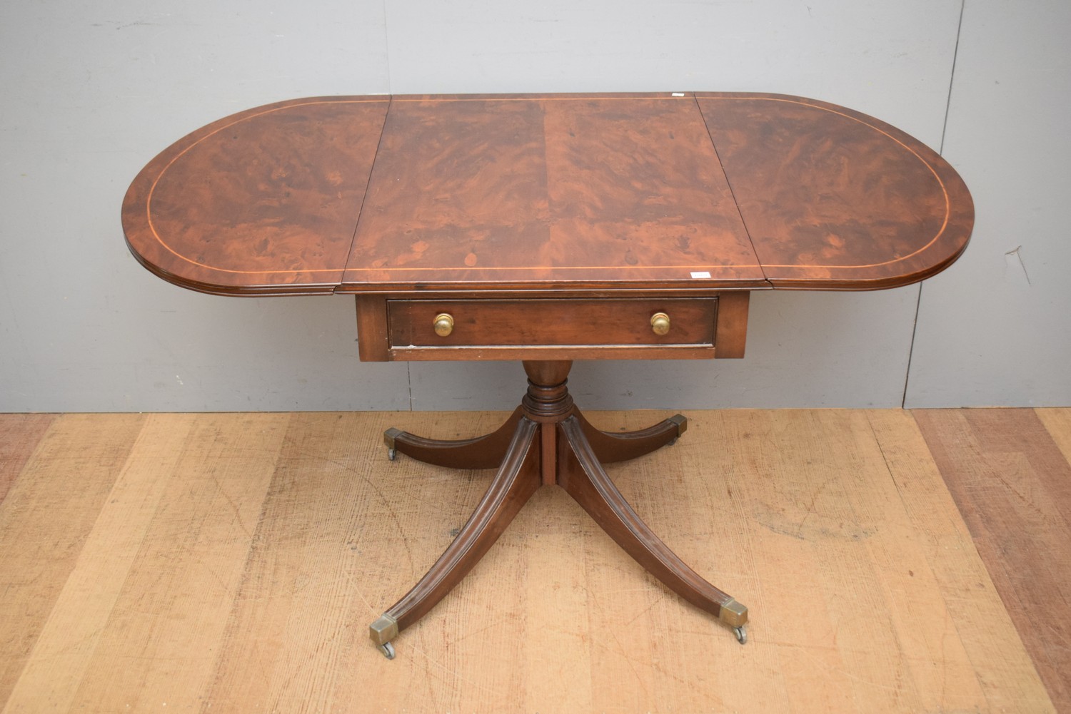 A TIMBER INLAID TWO DRAWER FLIP TOP BREAKFAST TABLE WITH BRASS HANDLES (75H X EXTENDED 138W X 85D CM)