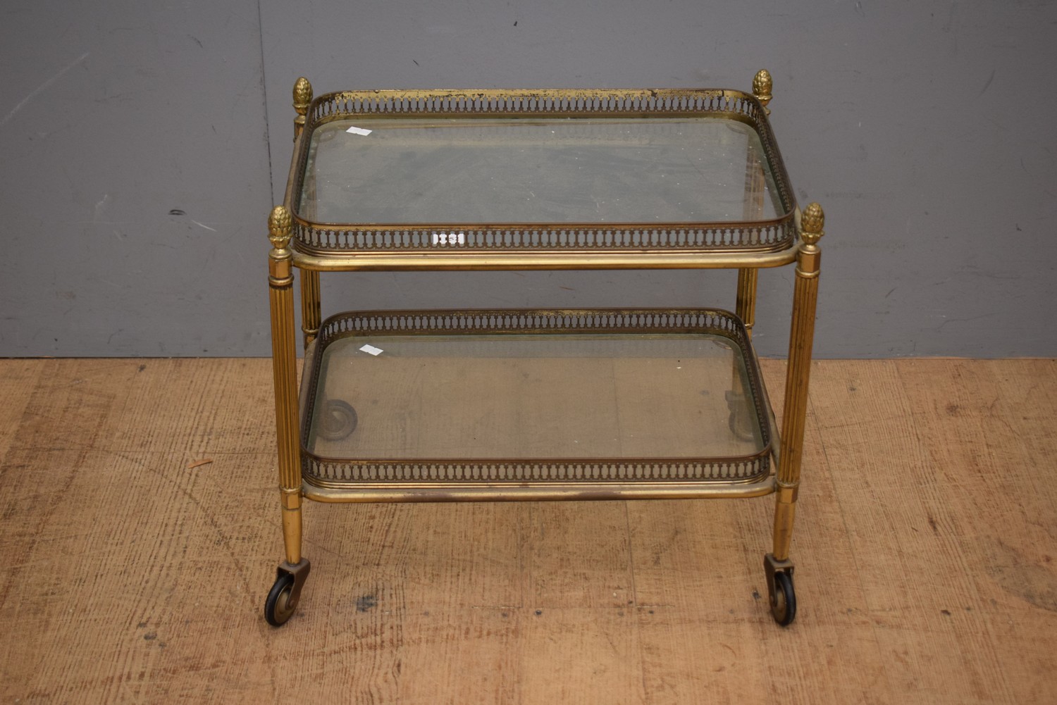 A BRASS AND GLASS PETITE TWO TIER TROLLEY (A/F) (41H X 45W X 31D CM)