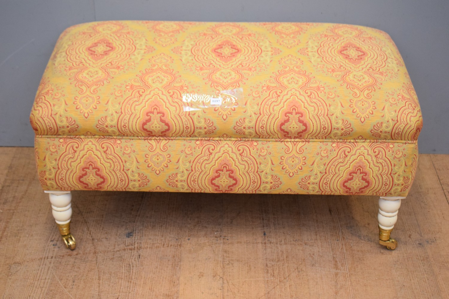 AN UPHOLSTERED OTTOMAN ON CASTORS (47H X 96W X 53D CM)