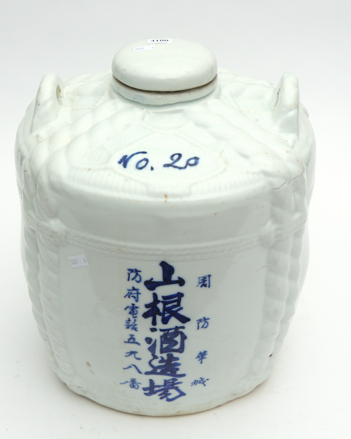 A JAPANESE PORCELAIN SAKE BARREL WITH WRITING ON BOTH SIDES AND ORIGINAL STOPPER