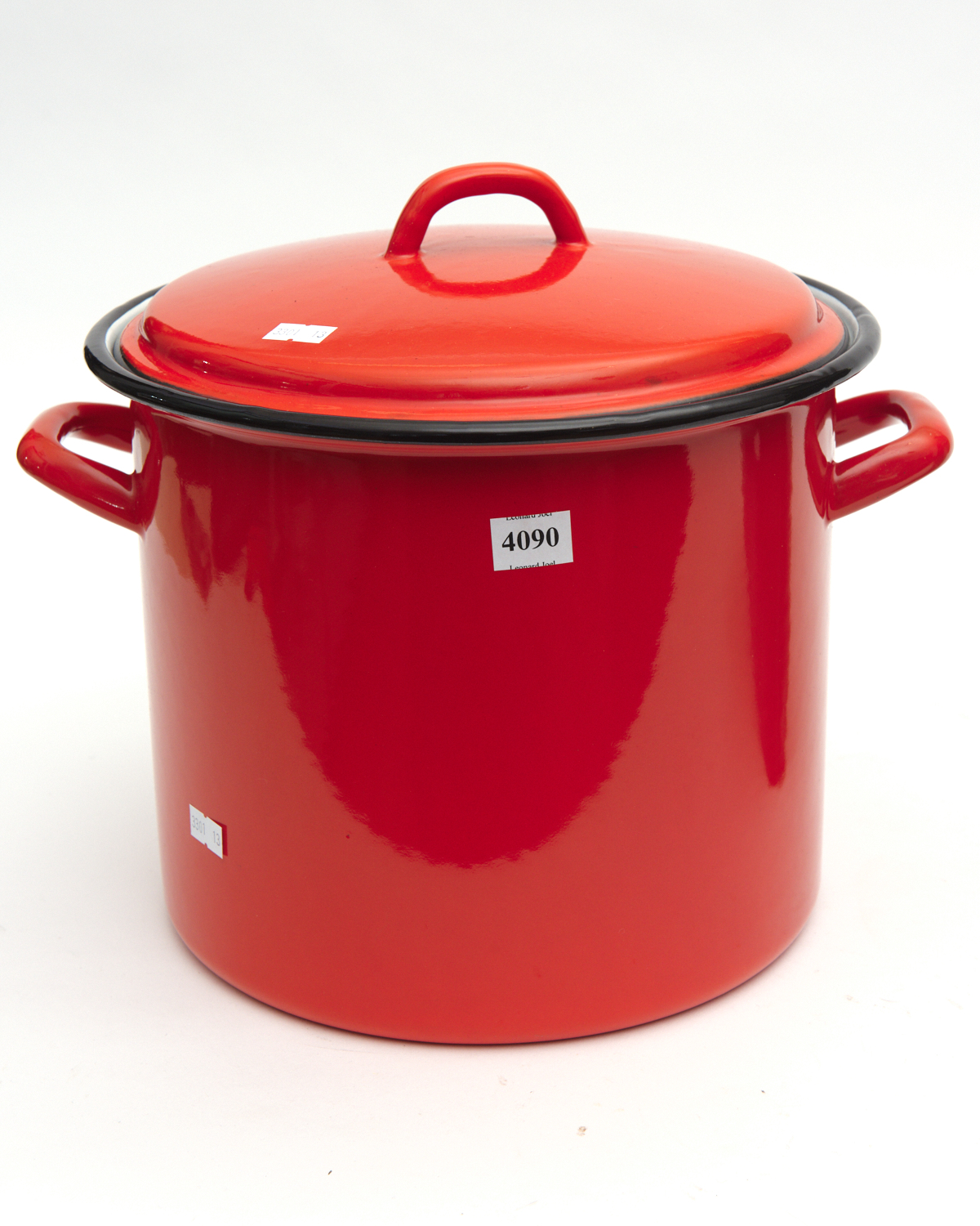 A LARGE 1940S RED ENAMEL LIDDED TWO HANDLED POT