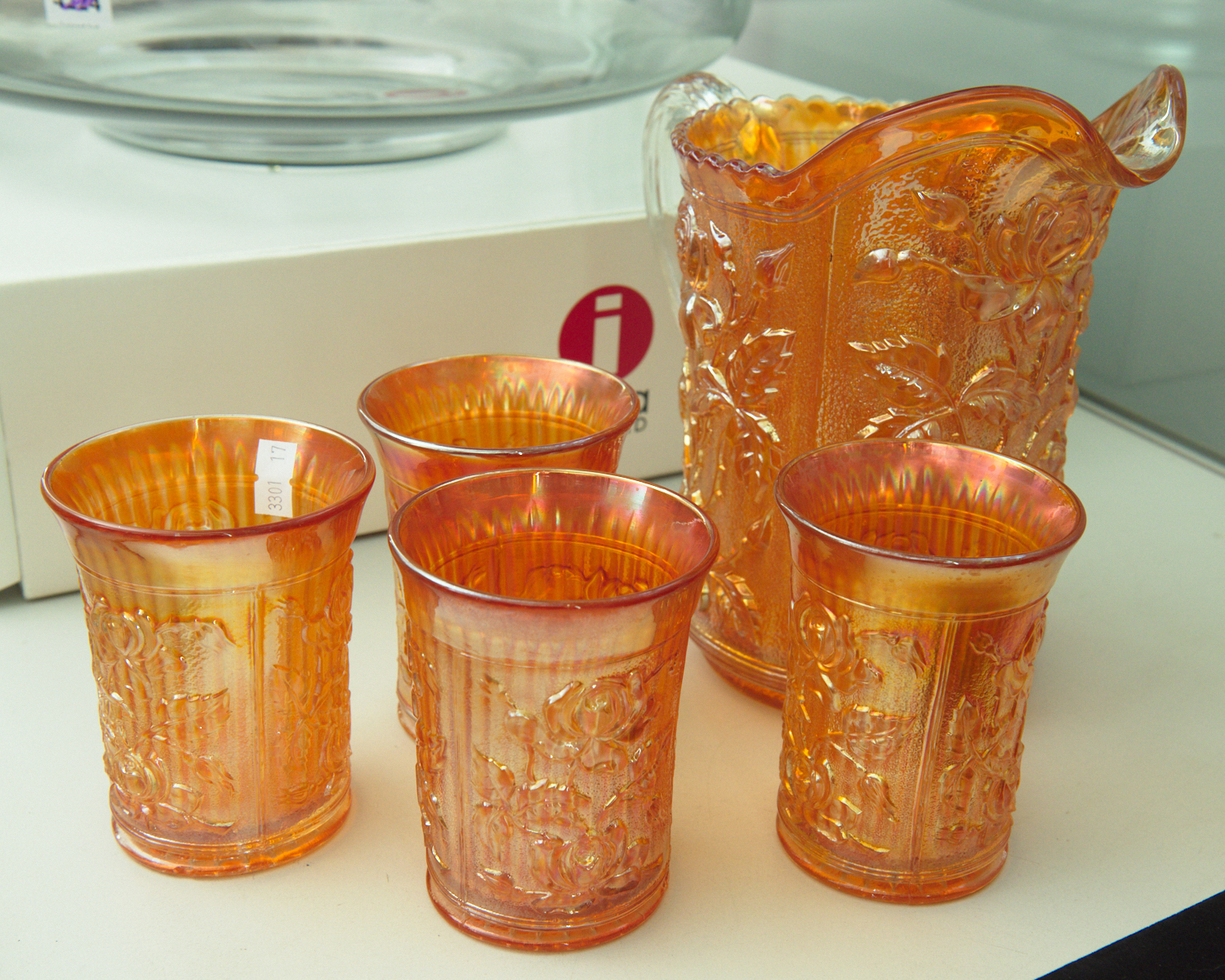 A 1900S CARNIVAL GLASS WATER JUG WITH FOUR MATCHED TUMBLERS