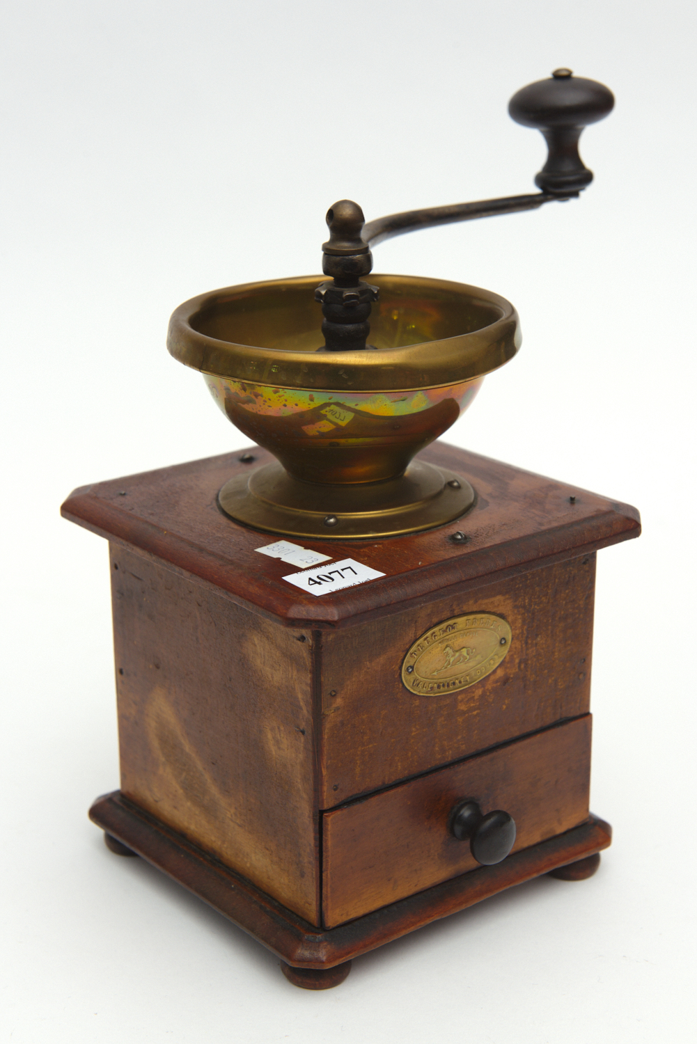 A 19TH CENTURY FRENCH PEUGEOT WOODEN BRASS AND STEEL COFFEE GRINDER