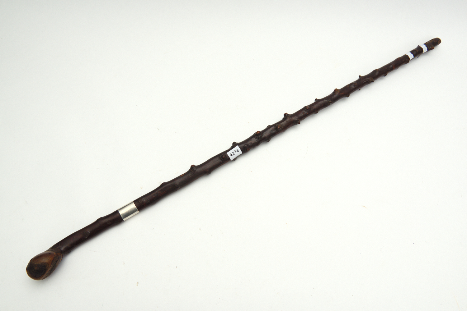 A 19TH CENTURY IRISH SHILLELAGH NOTTY BLACKTHORN WALKING STICK CLUB WITH STERLING SILVER BAND