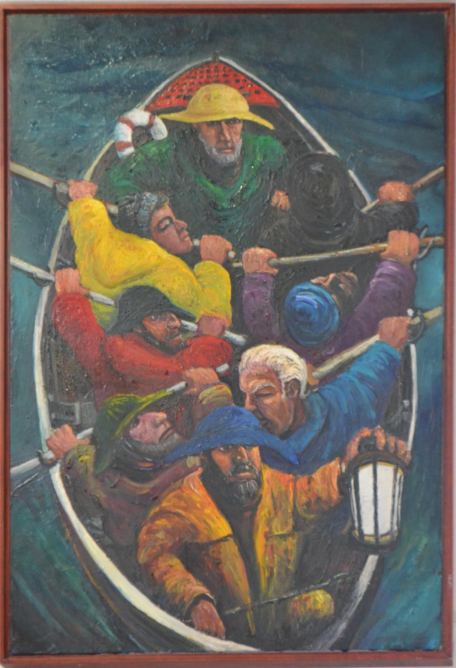 STEVE JONES, SEVEN MEN IN A BOAT, OIL ON CANVAS, 91 X 61CM, FRAME SIZE: 94 X 64CM, CONDITION: VERY GOOD