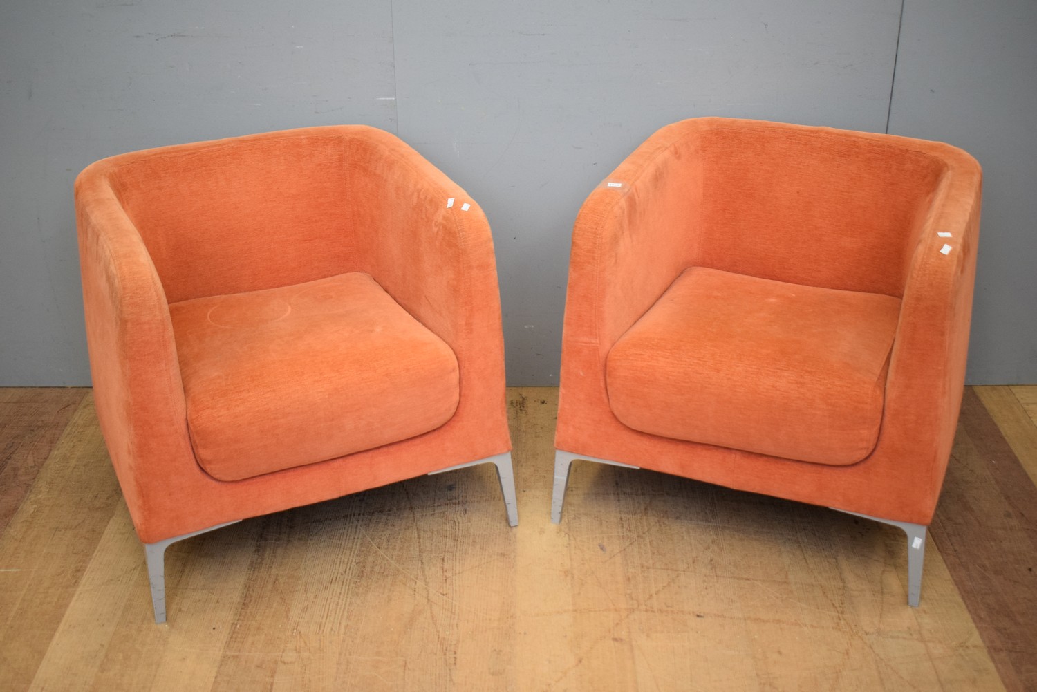 A PAIR OF ORANGE UPHOLSTERED SEGIS ARMCHAIRS (A/F) (72H X 70W X 70D CM)