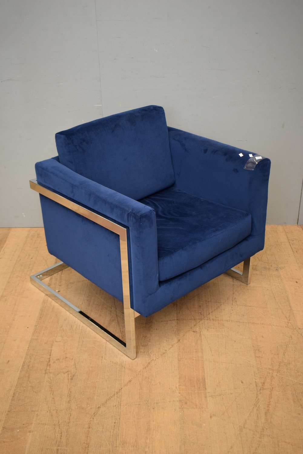 A NAVY VELVET REPLICA MILO BAUGHMAN VISITOR CHAIR (85H X 79W X 84D CM)