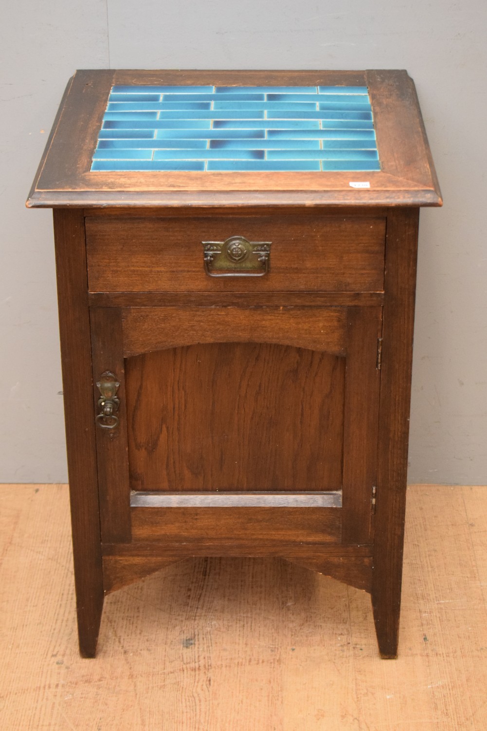 A SMALL TILED TOP CABINET (76H X 53W X 50D CM) (A/F)