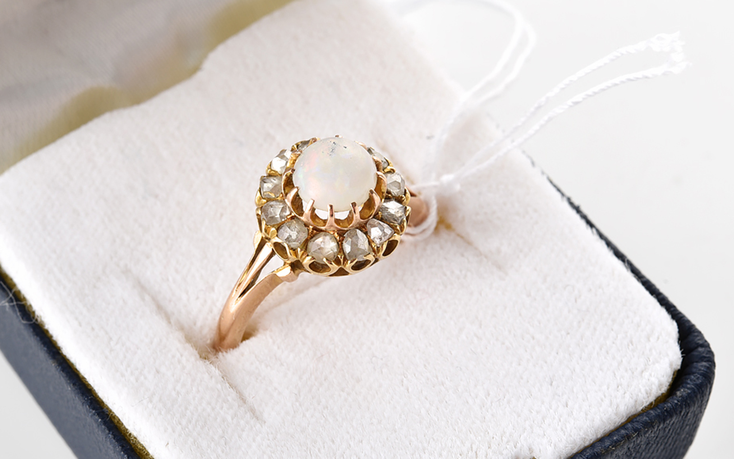 The opal cabochon is crazed, estimated 1.05cts, shows minimal colour display.