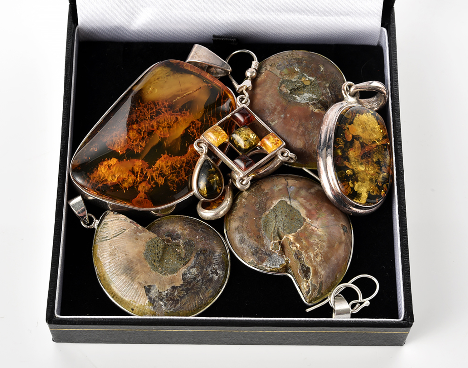 A COLLECTION OF AMMOLITE AND AMBER SET STERLING SILVER JEWELLERY
