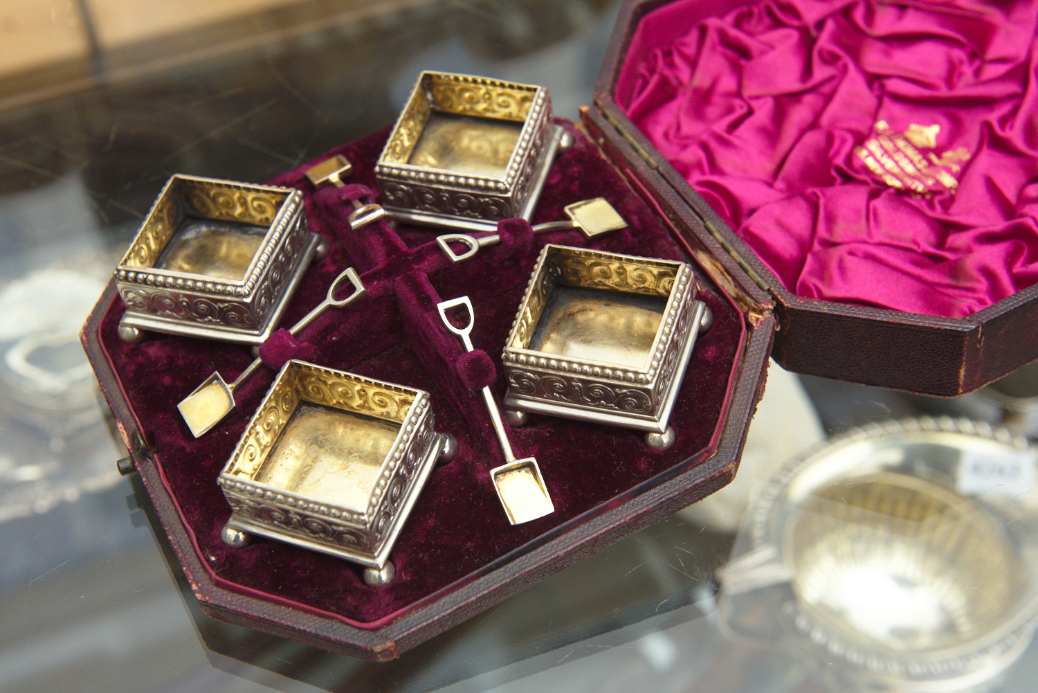 A CASED SET OF FOUR VICTORIAN STERLING SILVER SALT CELLARS, HORACE WOODWARD & CO., BIRMINGHAM, 1883, WITH FOUR NOVELTY SHOVEL-FORM SALT SPOONS OF VARIOUS MAKERS, APPROXIMATELY 102 GMS TOTAL SILVER WEIGHT (SECTION OF ONE SIDE OF THE CASE MISSING; HINGE AND SURROUNDING AREA OF CASE LOOSE)
