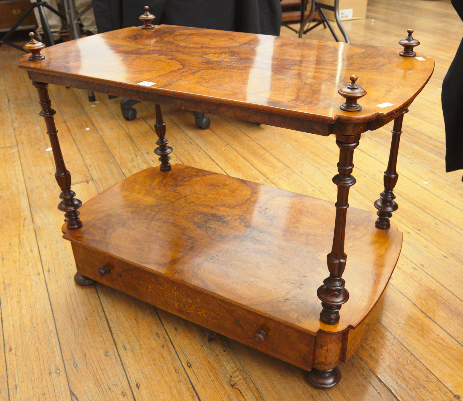 A TWO TIER WALNUT WHAT-NOT, 75.5 CM WIDE, 60 CM HIGH, 43 CM DEPTH