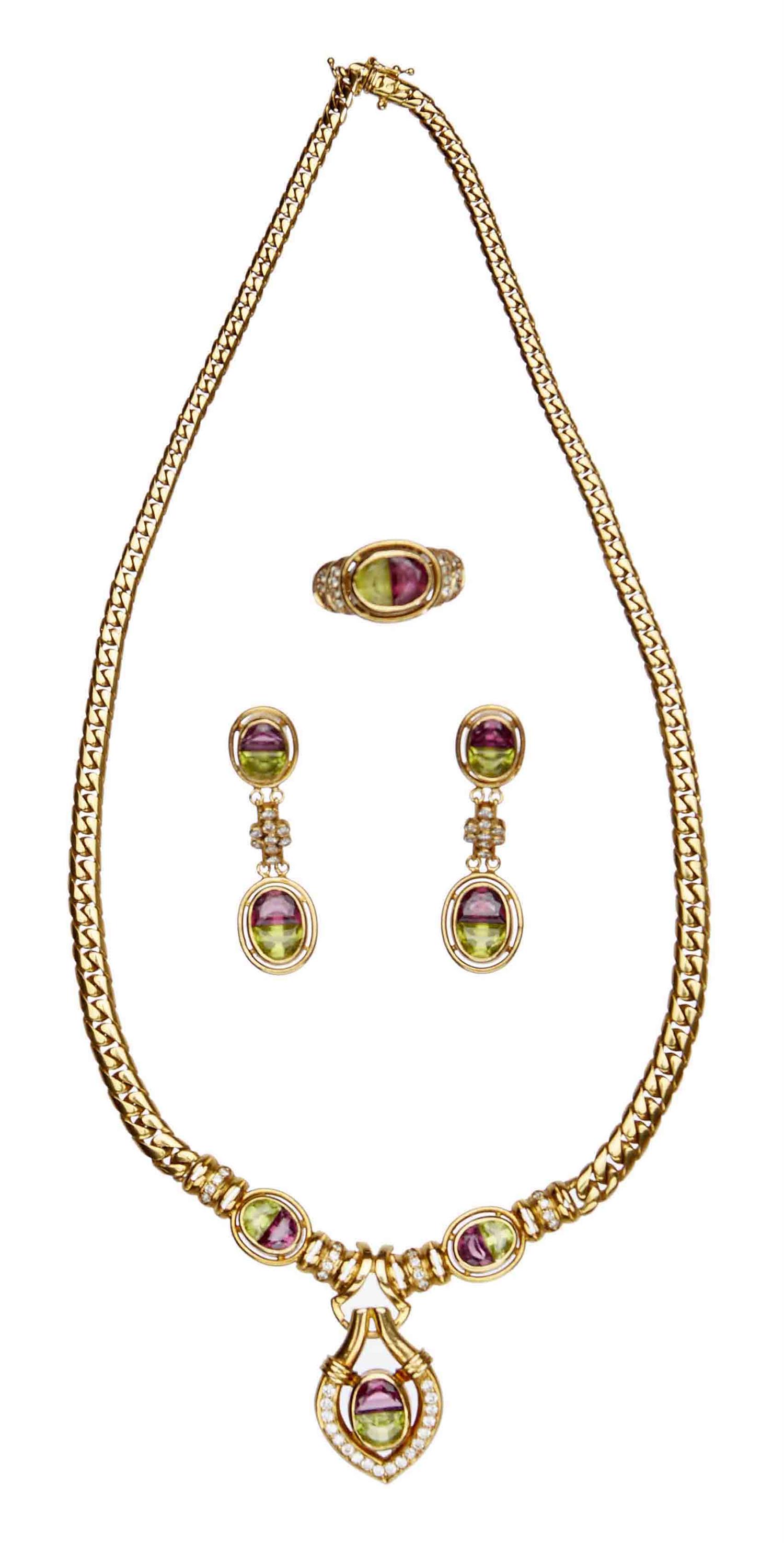 Comprising: a necklace designed as a line of graduated oval herringbone links centring an articulated openwork pear-shaped pendant collet-set with a half-moon peridot and amethyst partially framed by a line of brilliant-cut diamonds, flanked by a pair of similar stones between diamond spacers, together with a ring and pair of earrings en suite. Gross weight approximately 46 grams; necklace inner circumference approximately 380mm; ring size O; earring length approximately 40mm, post and scroll fittings.