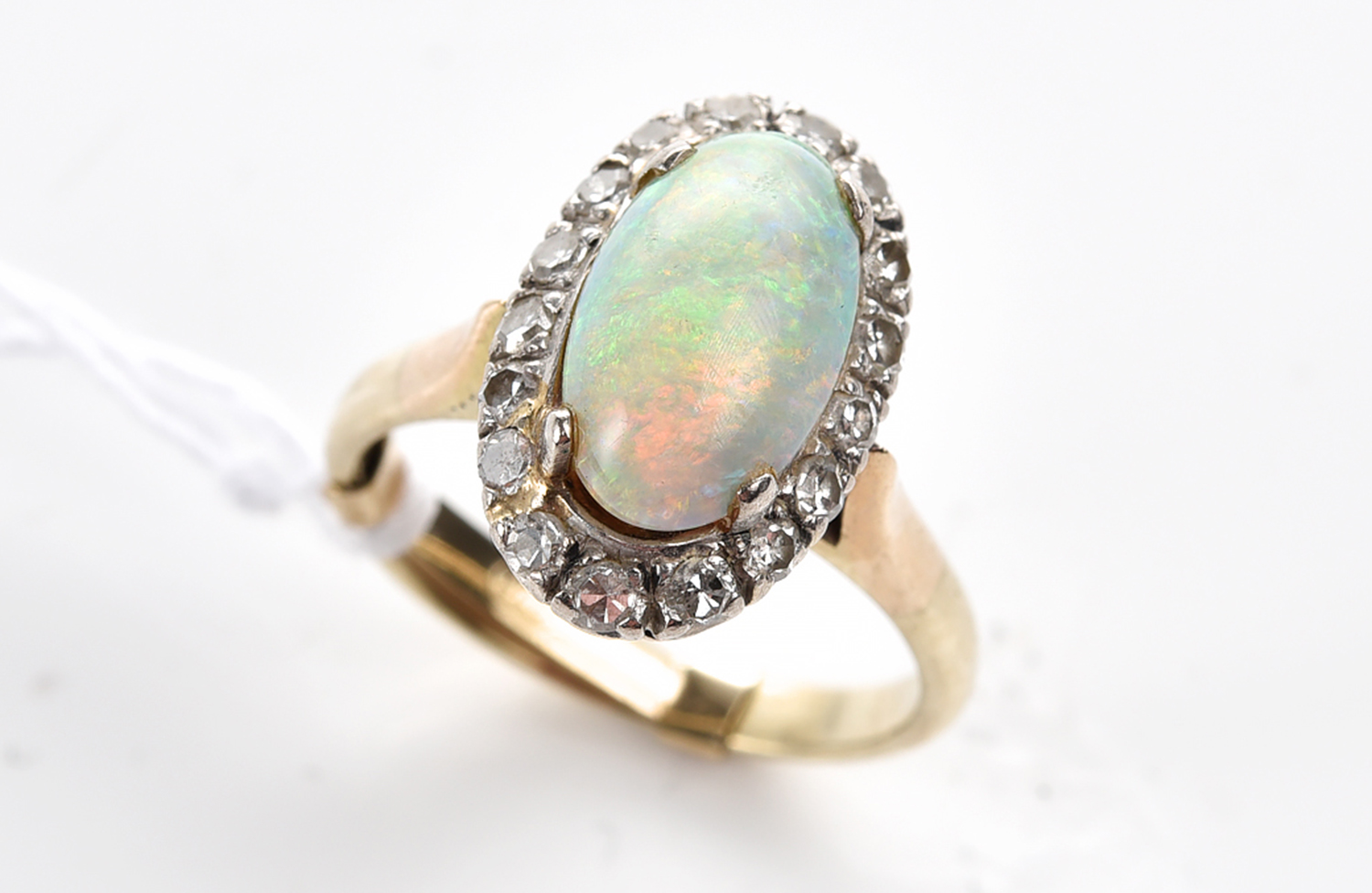 AN OPAL AND DIAMOND CLUSTER RING IN 18CT AND 9CT GOLD, RING SIZE K-L, 4.8GMS