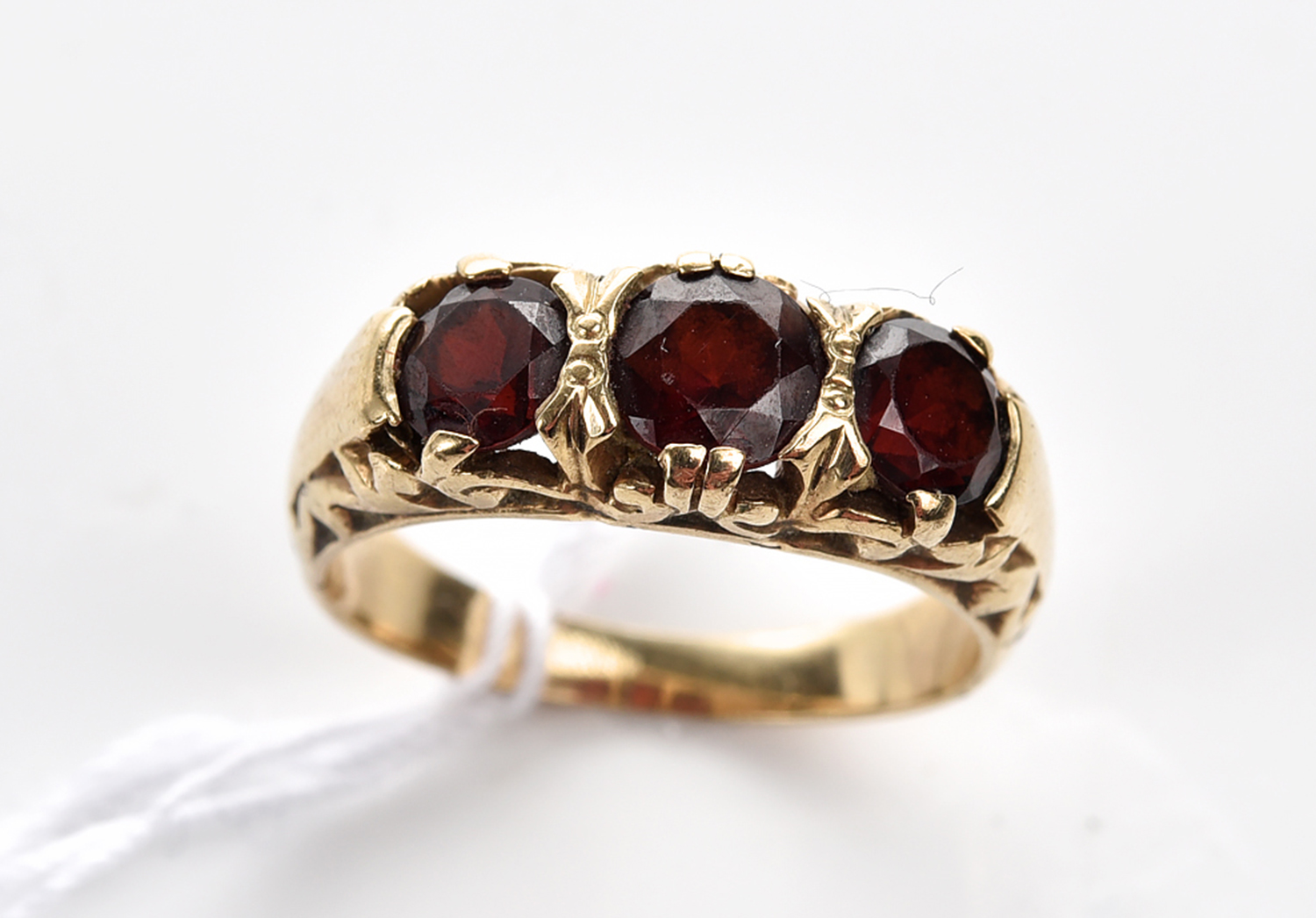 A VICTORIAN THREE STONE GARNET RING ACID TESTED IN 9CT GOLD, RING SIZE J, 3.4GMS