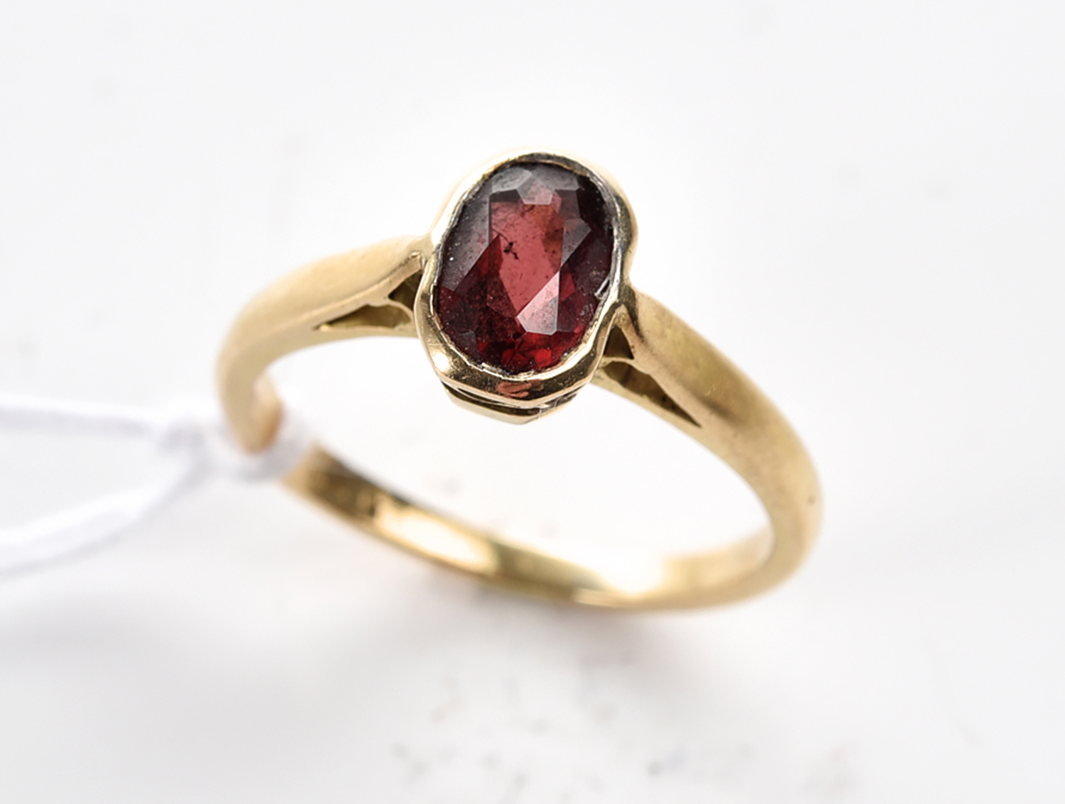 A GARNET RING IN 18CT GOLD, SIZE F, 1.9GMS