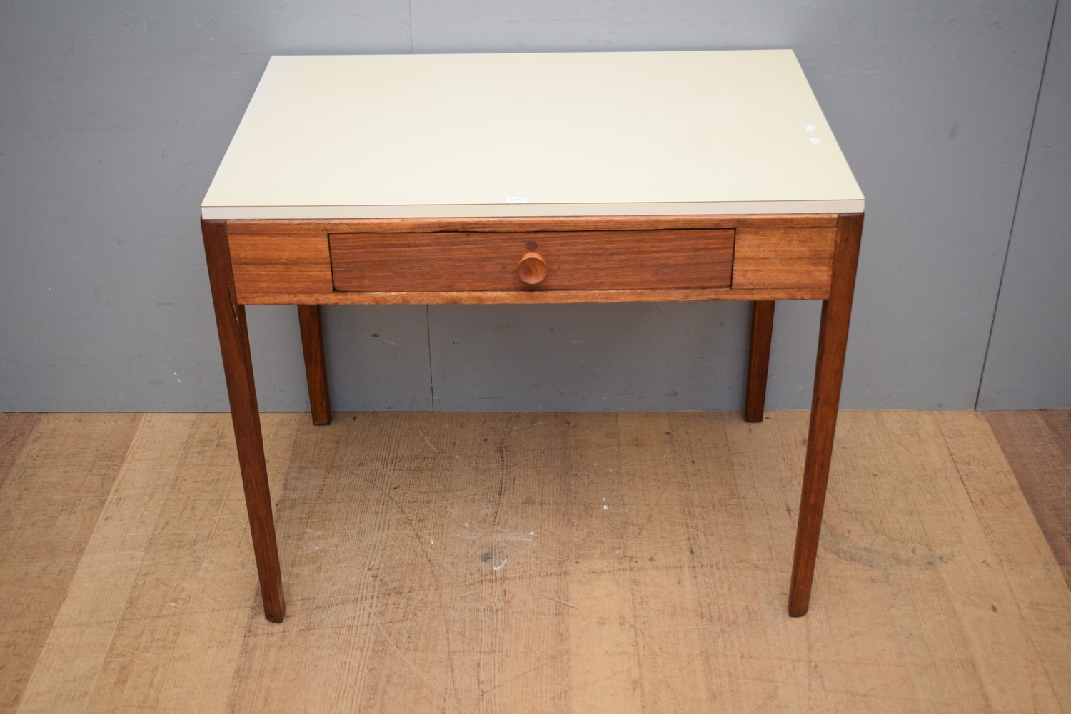 A TIMBER SINGLE DRAWER OCCASIONAL TABLE WITH LAMINATE TOP (77H X 90W X 60D CM)