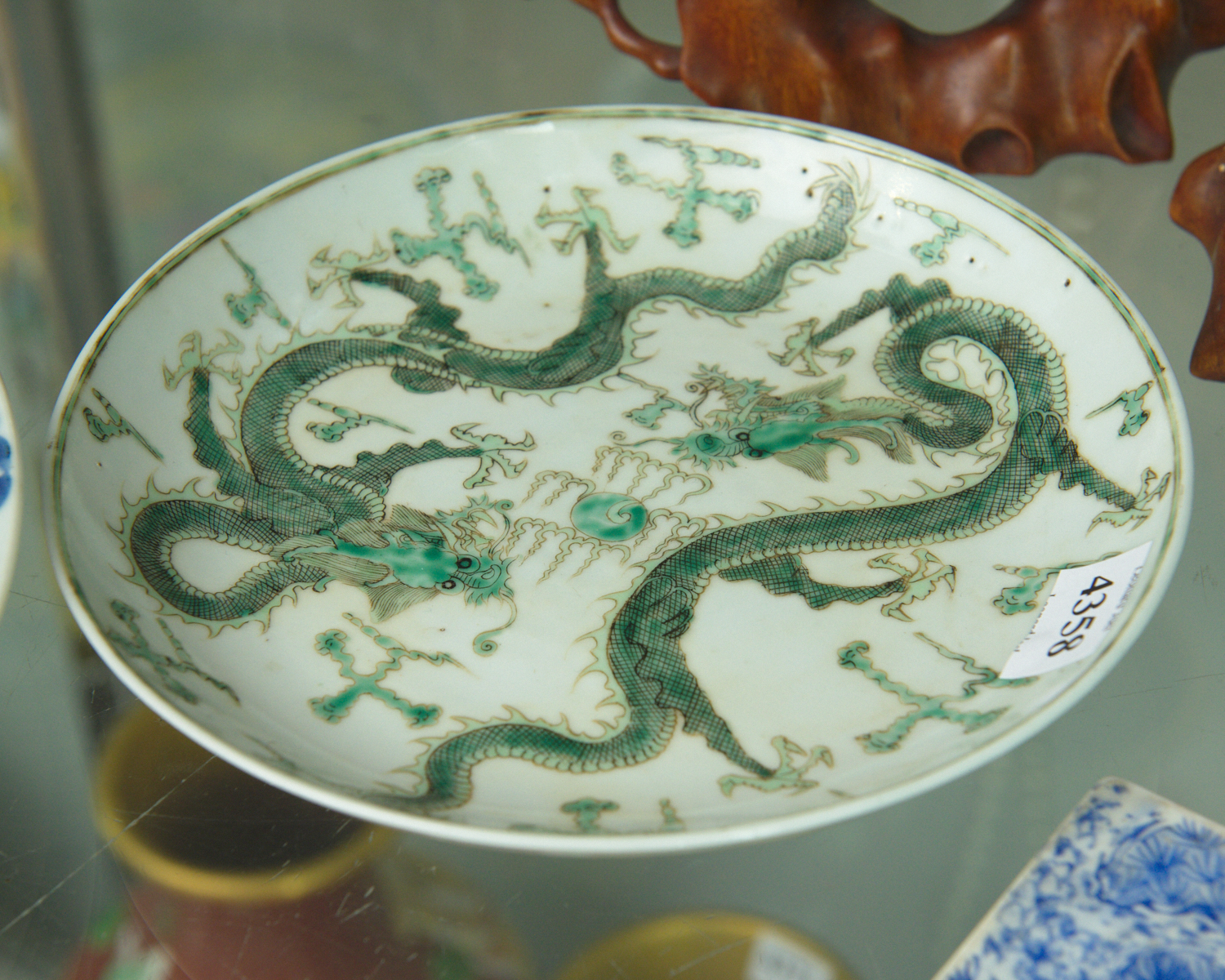 A GLAZED PORCELAIN PLATE PAINTED WITH A DRAGON, 17 CM DIAMETER
