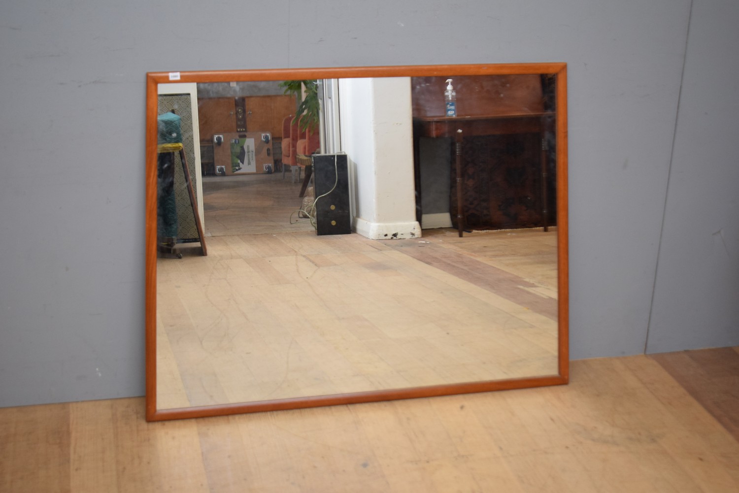 A TEAK FRAMED TRAPEZIUM SHAPED MIRROR (92H X 119W AT WIDEST, 110W AT NARROWEST CM)