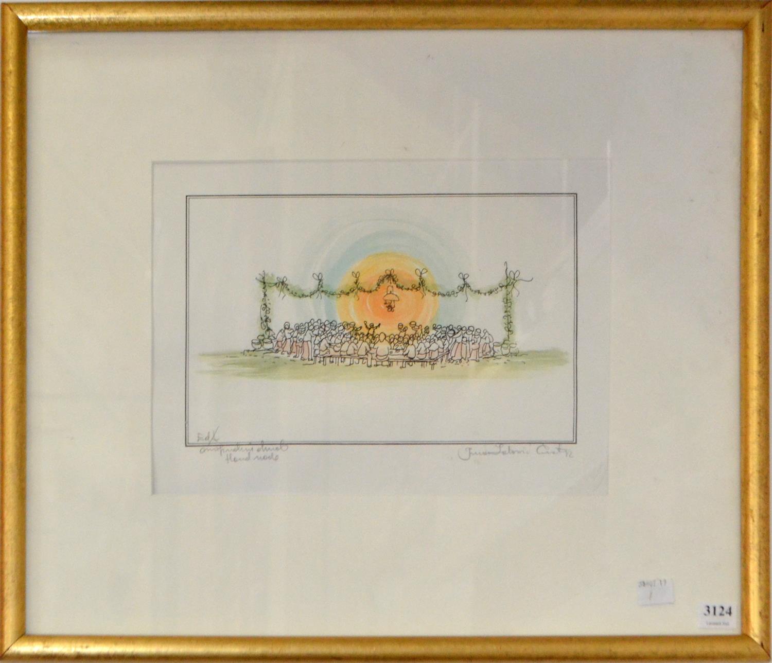 ARTIST UNKNOWN, GATHERING OF FIGURES, HAND COLOURED PRINT, 18 X 25CM, FRAME SIZE: 43 X 50CM, CONDITION: GOOD, COCKLING