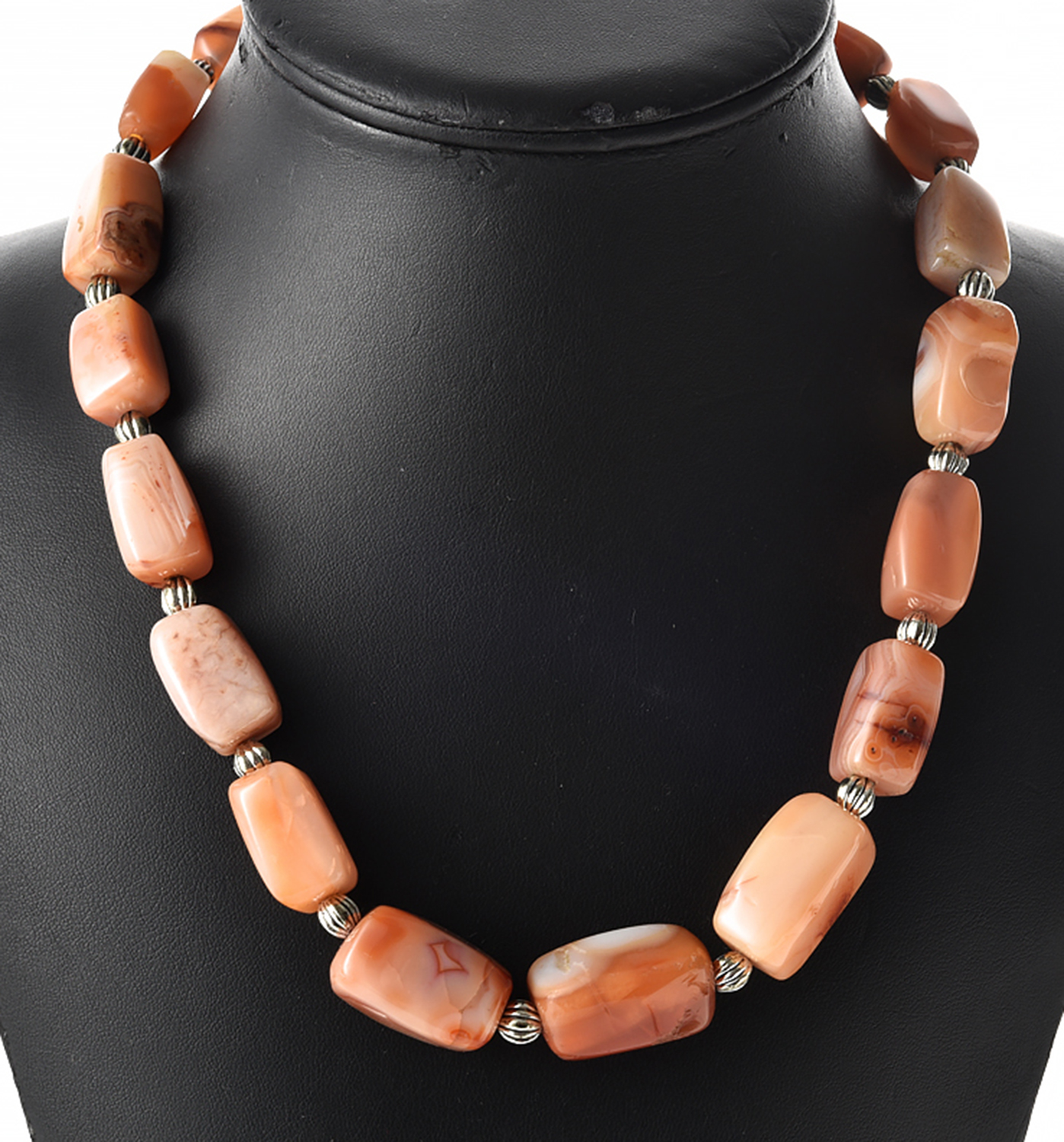 AN AGATE BEAD NECKLACE WITH SILVER SPACER BEADS, TO A MAGNETIC CLASP, TOTAL LENGTH 520MM,
