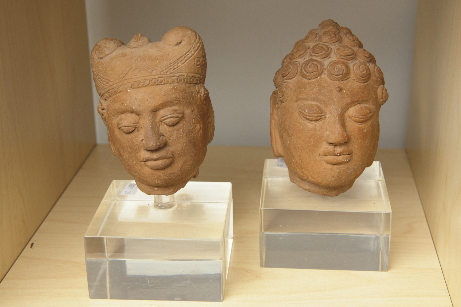 TWO INDONESIAN TERRACOTTA HEADS ON PLINTHS