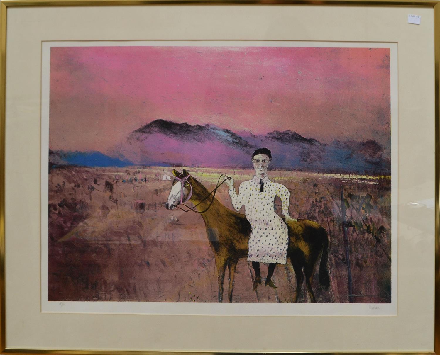 SIDNEY NOLAN, STEVE HART DRESSES AS A GIRL, LITHOGRAPH A/P, 47 X 63CM, FRAME SIZE: 67 X 82CM, CONDITION: LIGHT FADING, OTHERWISE GOOD, LEONARD JOEL DELIVERY SIZE: MEDIUM