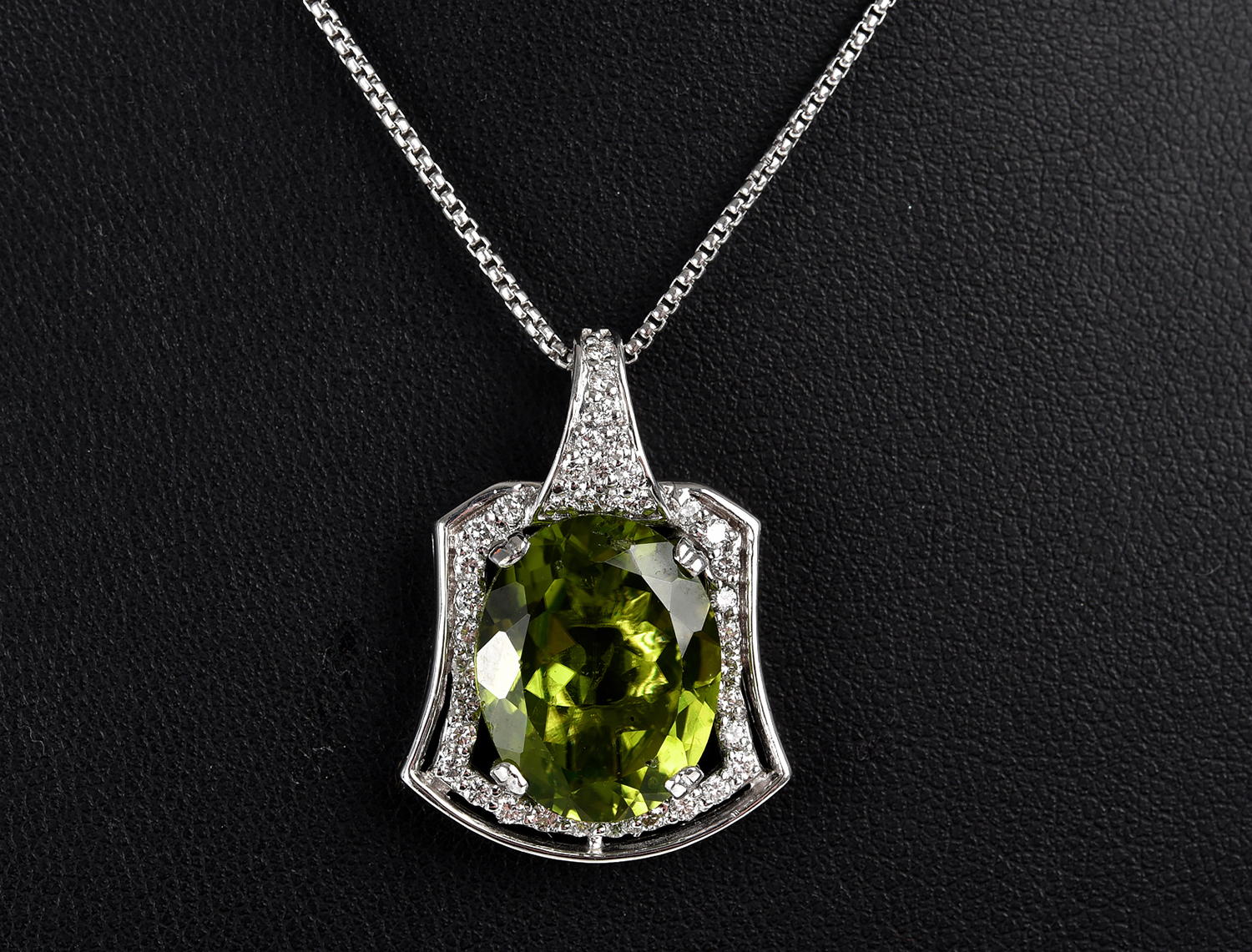 The peridot presents some minor abrasions to facet edges and a small chip on the table, only visible with 10x loupe.