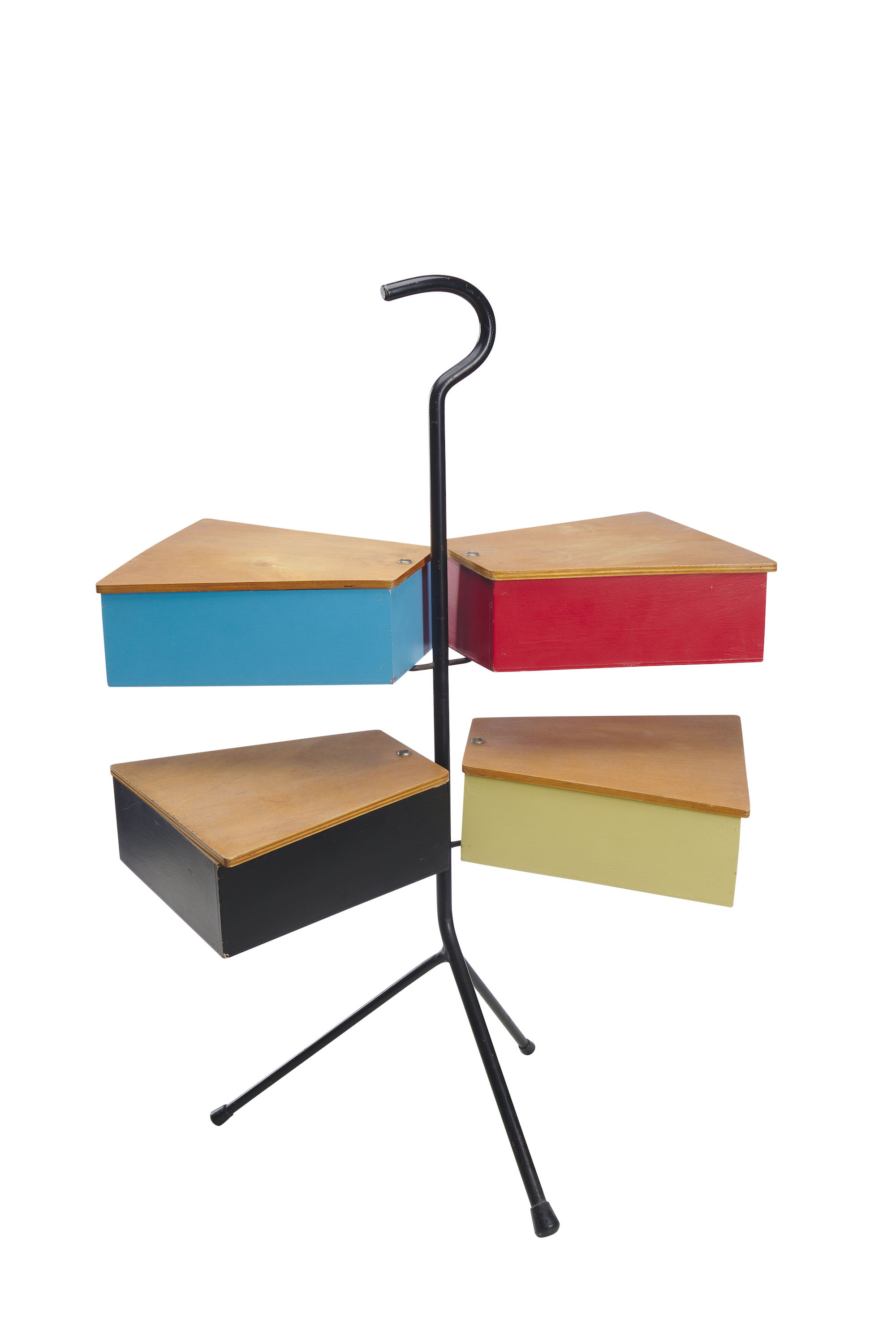 Blue, red, black and pale yellow boxes with adjustable lids, connected to metal frame