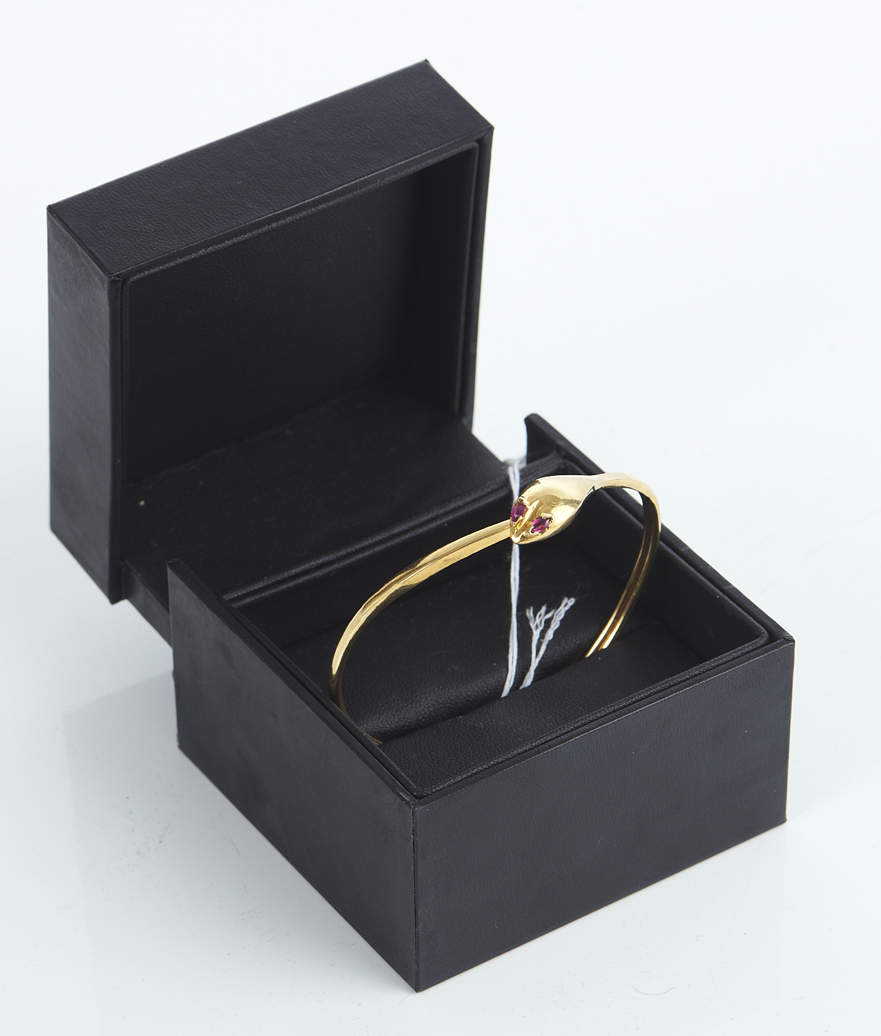 A GOLD AND RUBY SERPENT BANGLE, IN 18CT GOLD, INNER DIAMETER 60MM, 11.89 GMS